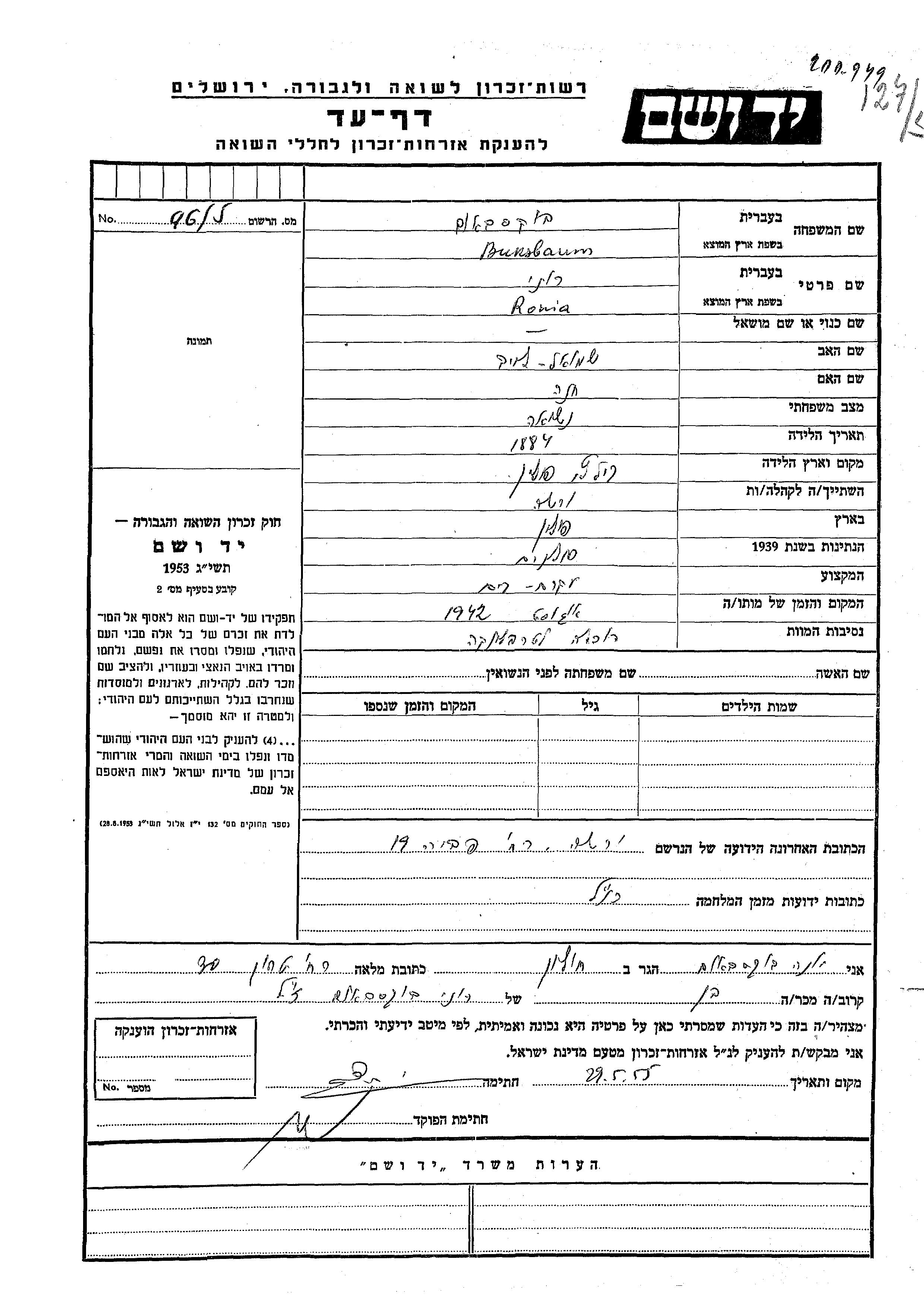 Roni Ronia Buksbaum wurde im Jahr 1884 geboren. Sie war die Tochter von Shmuel Leib und Khana. Sie war Hausfrau.