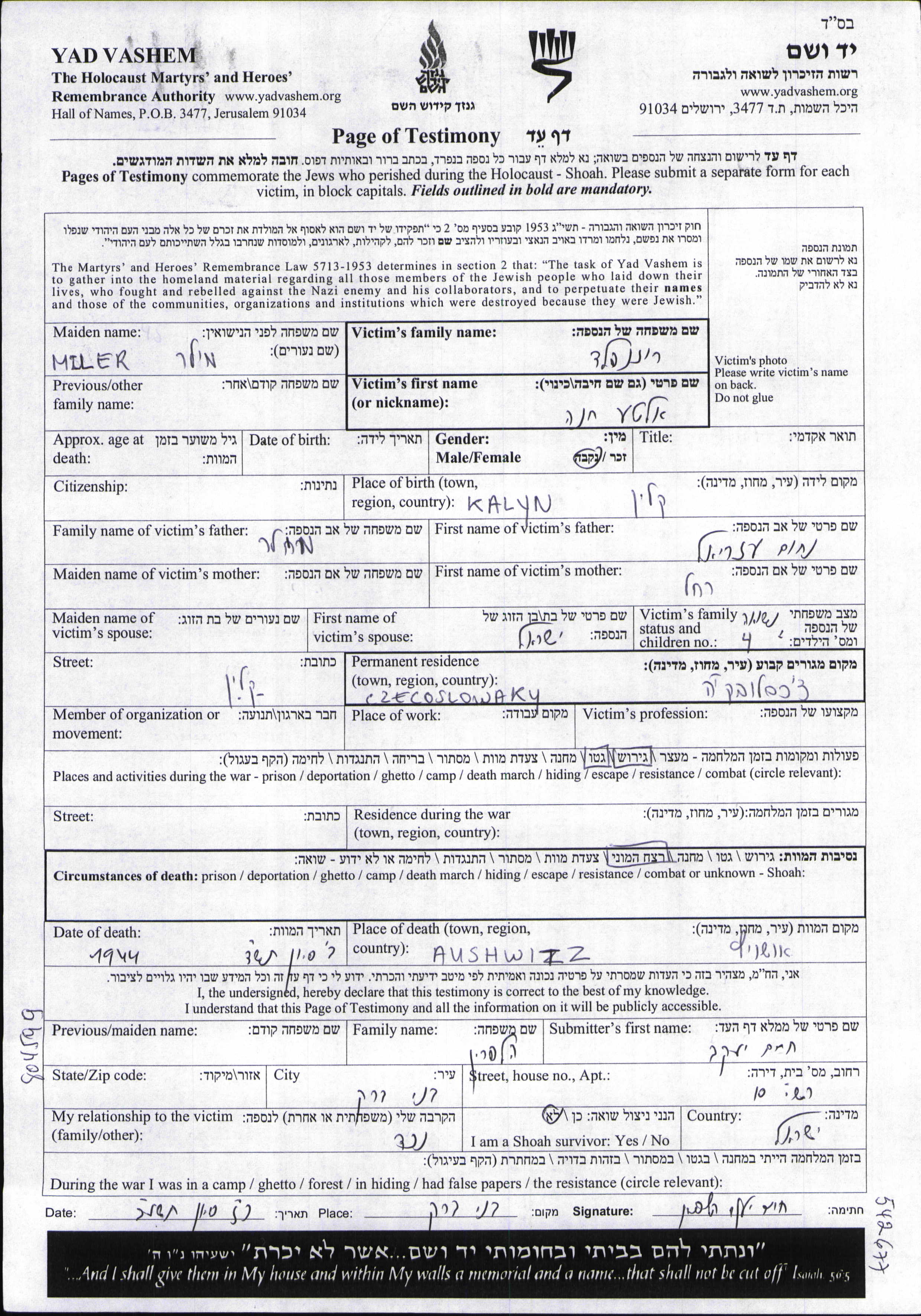 Alte Chana Rozenfeld, geb. Miler wurde in Kalin, Tschechoslowakei geboren. Sie war die Tochter von Nakhum Azriel und Rachel. Sie war mit Yisrael Verheiratet. Vor dem Zweiten Weltkrieg lebte sie in Kalin, Tschechoslowakei.
