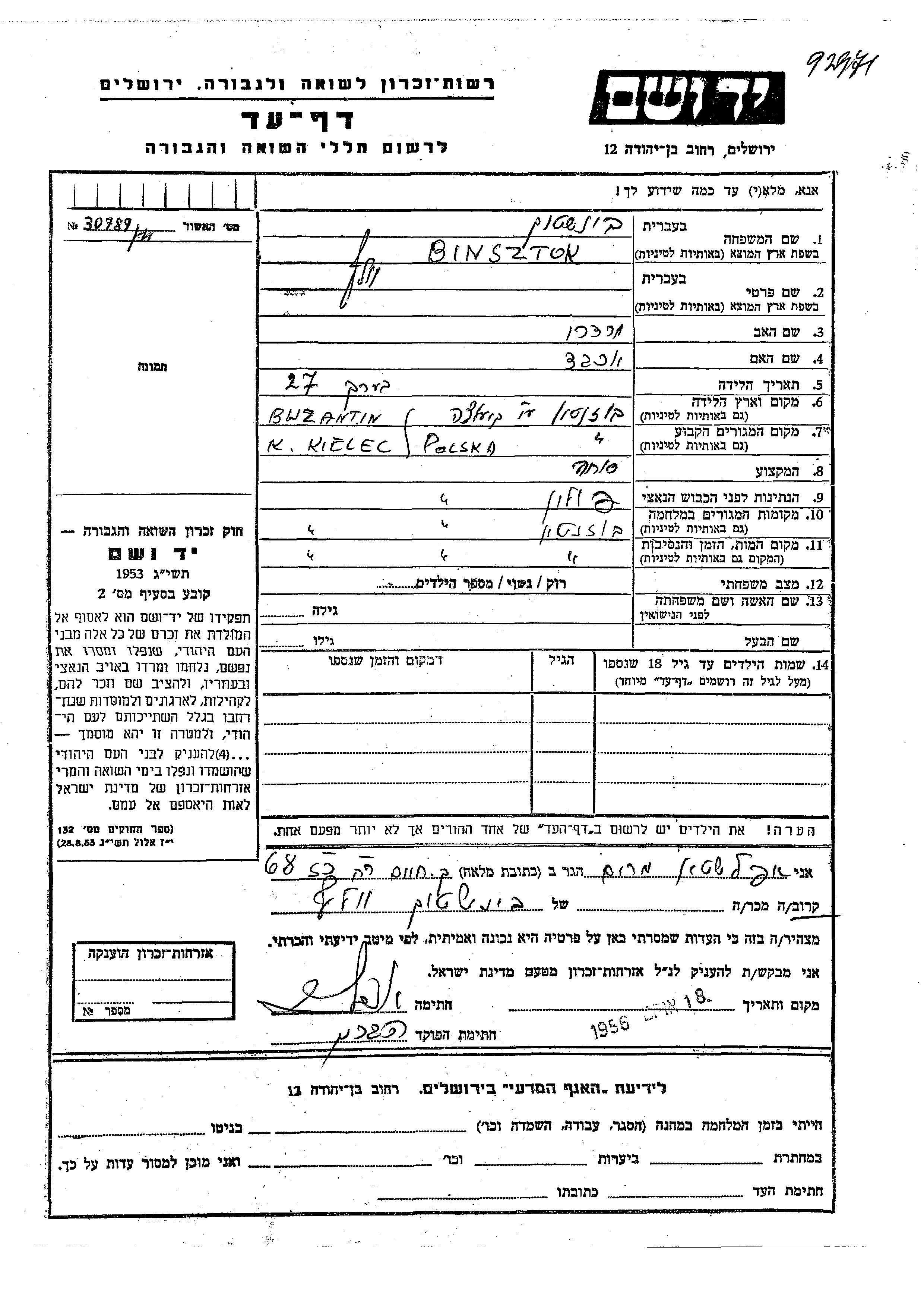 Volf Binsztok wurde in Bodzentyn, Polen geboren. Er war der Sohn von Mordekhai und Yokheved. Er war Kaufmann/-frau. Vor dem Zweiten Weltkrieg lebte er in Bodzentyn, Polen. Während des Krieges war er in Bodzentyn, Polen.