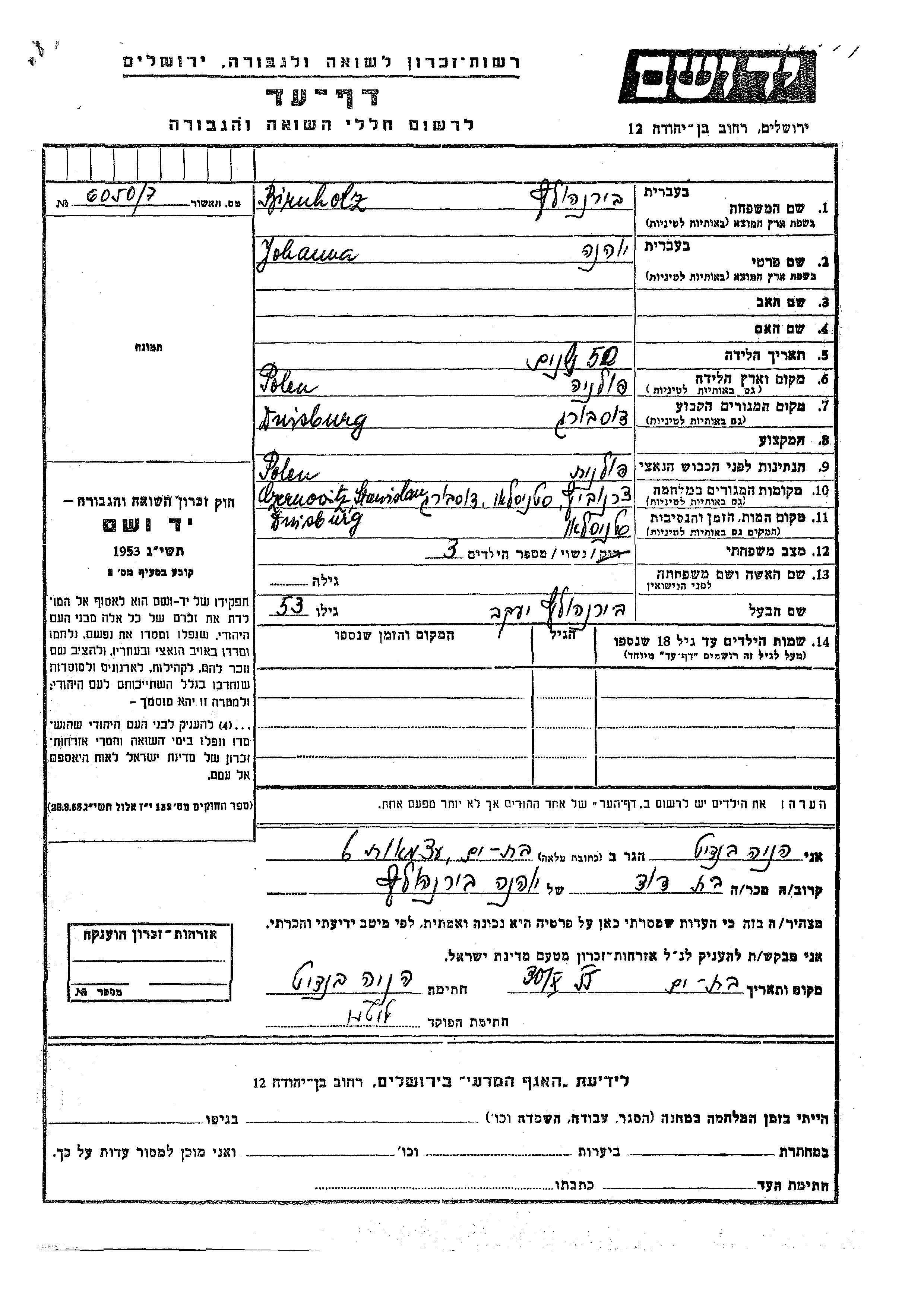 Yohanna Birnholz wurde in Polen geboren. Sie war mit Yaakov Verheiratet. Vor dem Zweiten Weltkrieg lebte sie in Duisburg, Deutsches Reich.