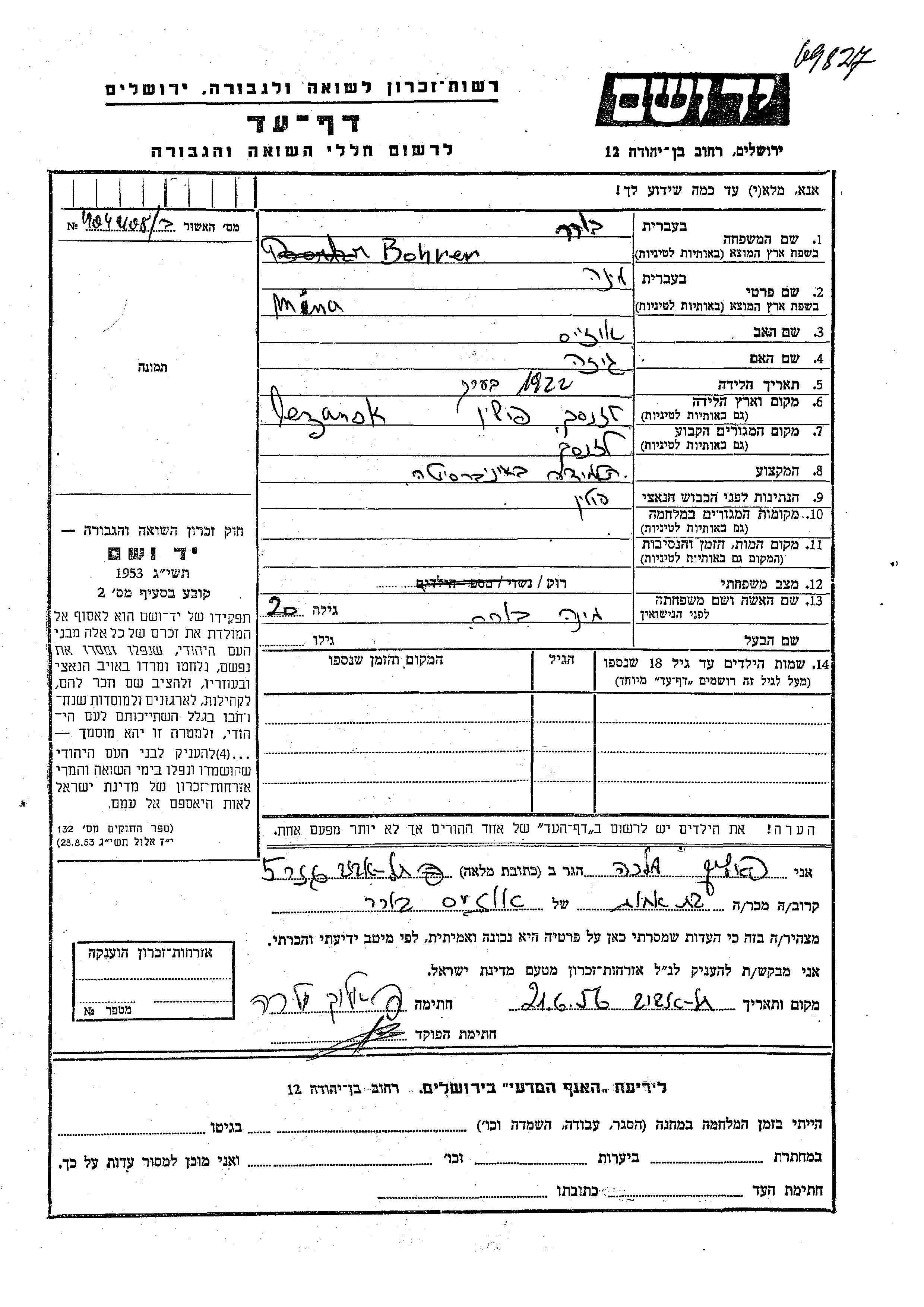 Mina Bohrer wurde im Jahr 1922 in Lezansk, Polen geboren. Sie war die Tochter von Ozias und Giza. Sie war Student und Ledig. Vor dem Zweiten Weltkrieg lebte sie in Lezansk, Polen.