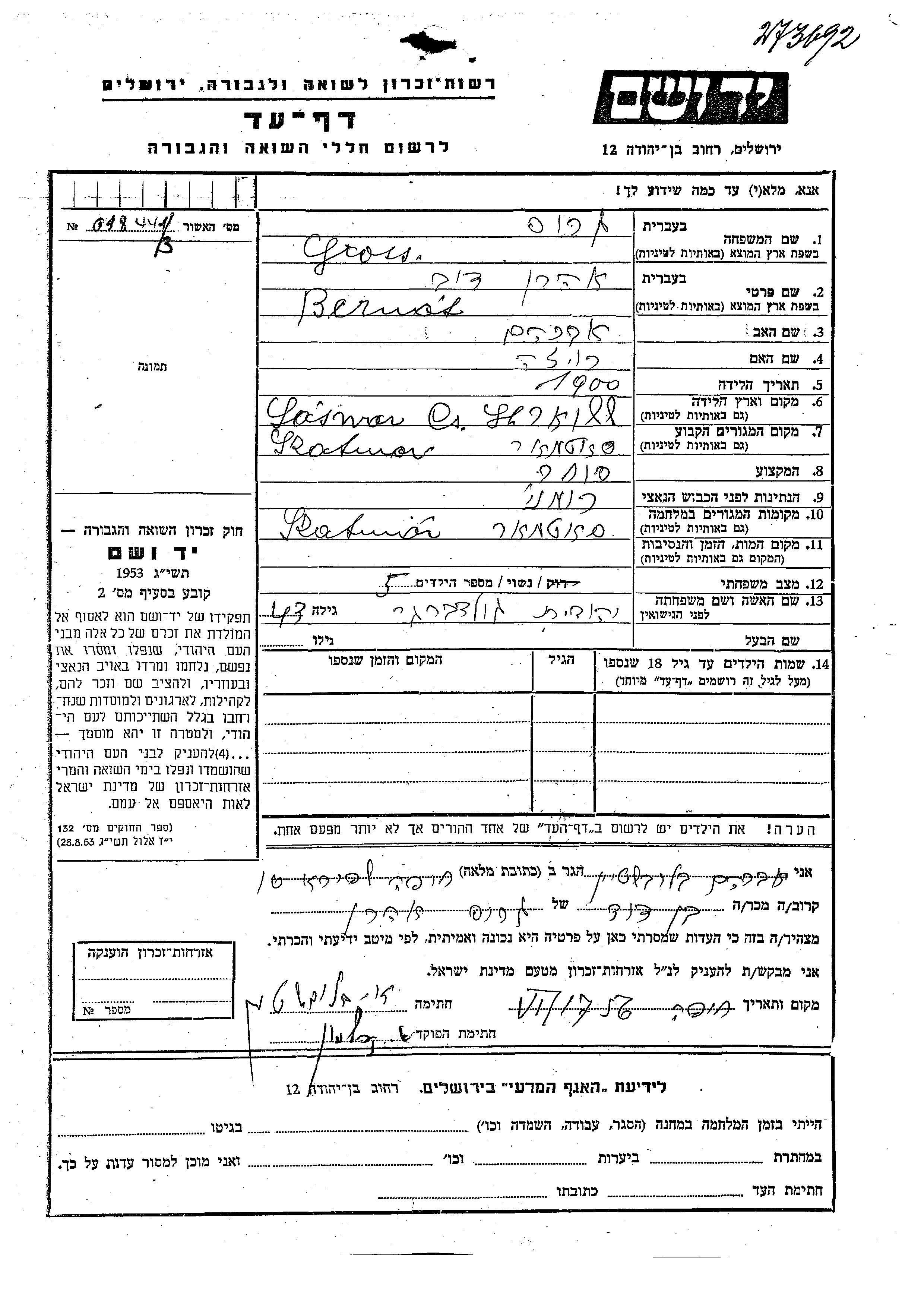 Gros | Aharon Dov Bernat | Szatmar, Rumänien | Liste ermordeter Juden aus Gedenkbuechern (Yizkor Books) | |