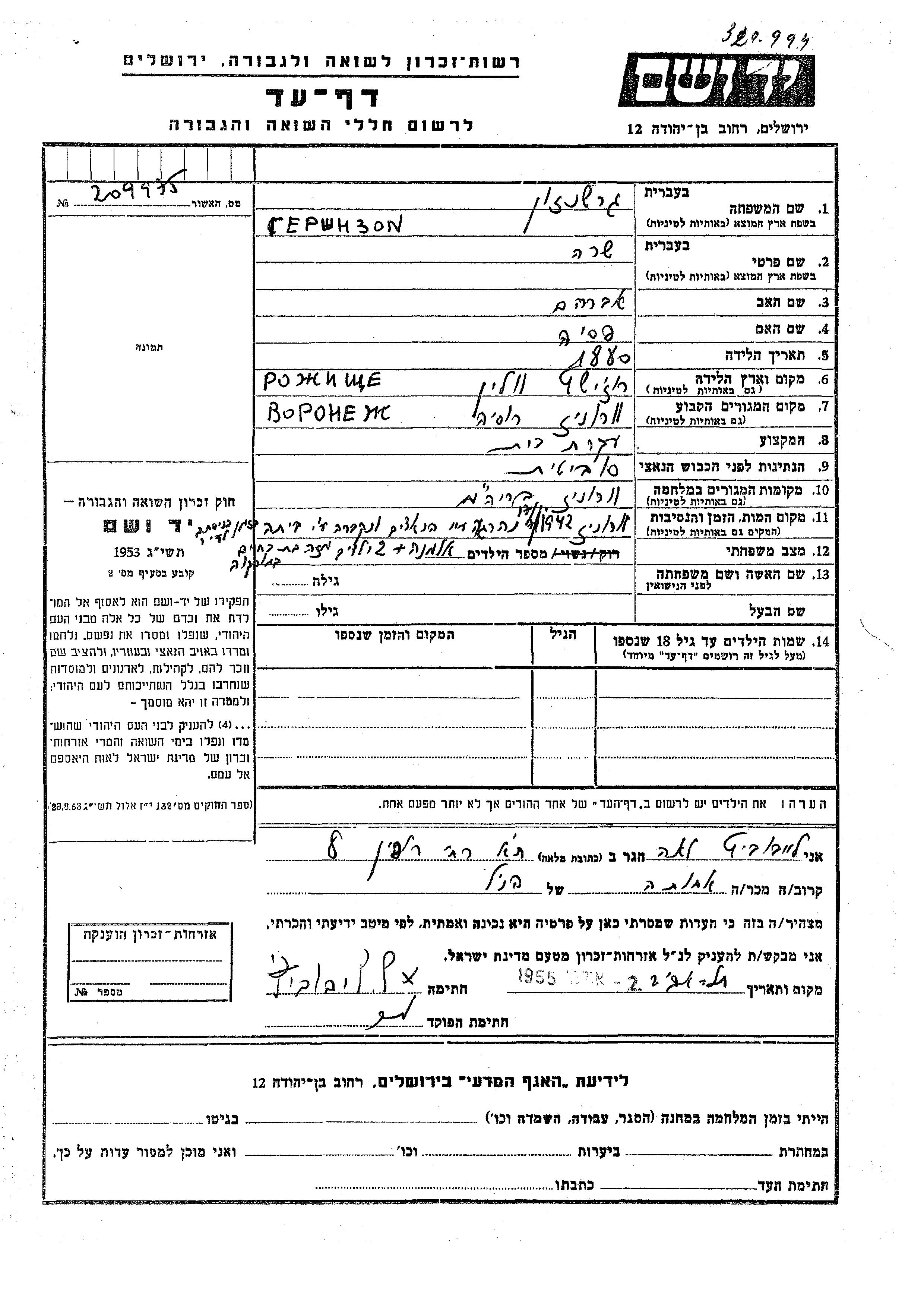 Sara Gershenzon wurde im Jahr 1880 geboren. Sie war die Tochter von Avraham und Pesia. Sie war Hausfrau und Witwe.