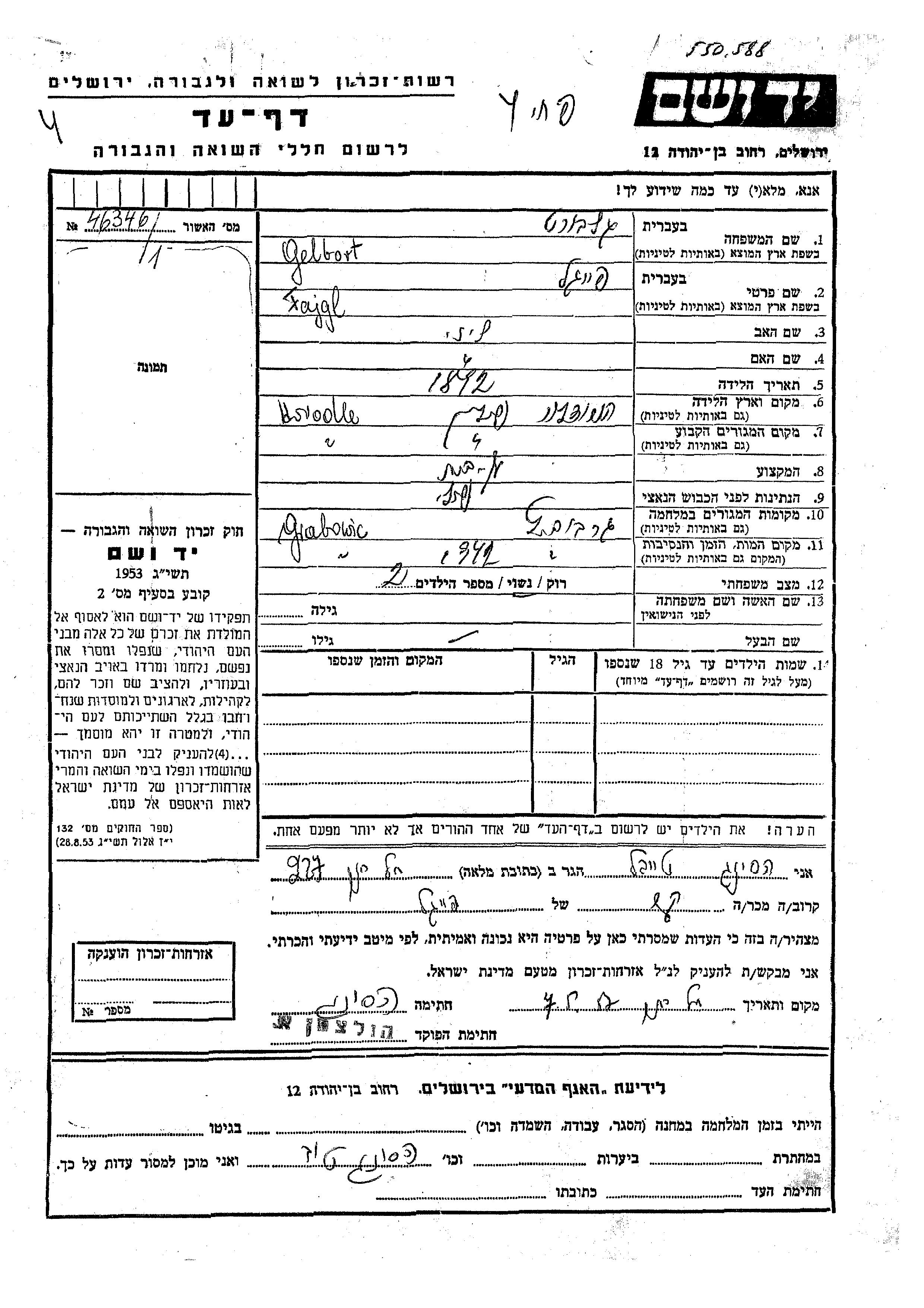 Fajgl Gelbort wurde im Jahr 1892 in Horodlo, Polen geboren. Sie war Hausfrau und Verheiratet. Vor dem Zweiten Weltkrieg lebte sie in Horodlo, Polen. Während des Krieges war sie in Grabowiec, Polen.