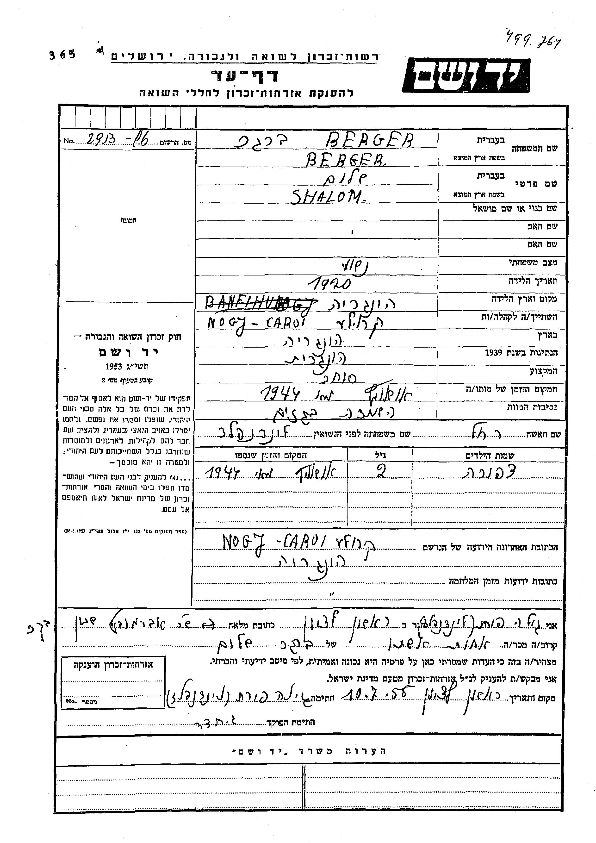 Shalom Berger wurde im Jahr 1920 in Ungarn geboren. Er war Kaufmann/-frau und mit Rakhel, geb. Lindenfeld Verheiratet. Vor dem Zweiten Weltkrieg lebte er in Nagykaroly, Rumänien. Während des Krieges war er in Nagykaroly, Rumänien.