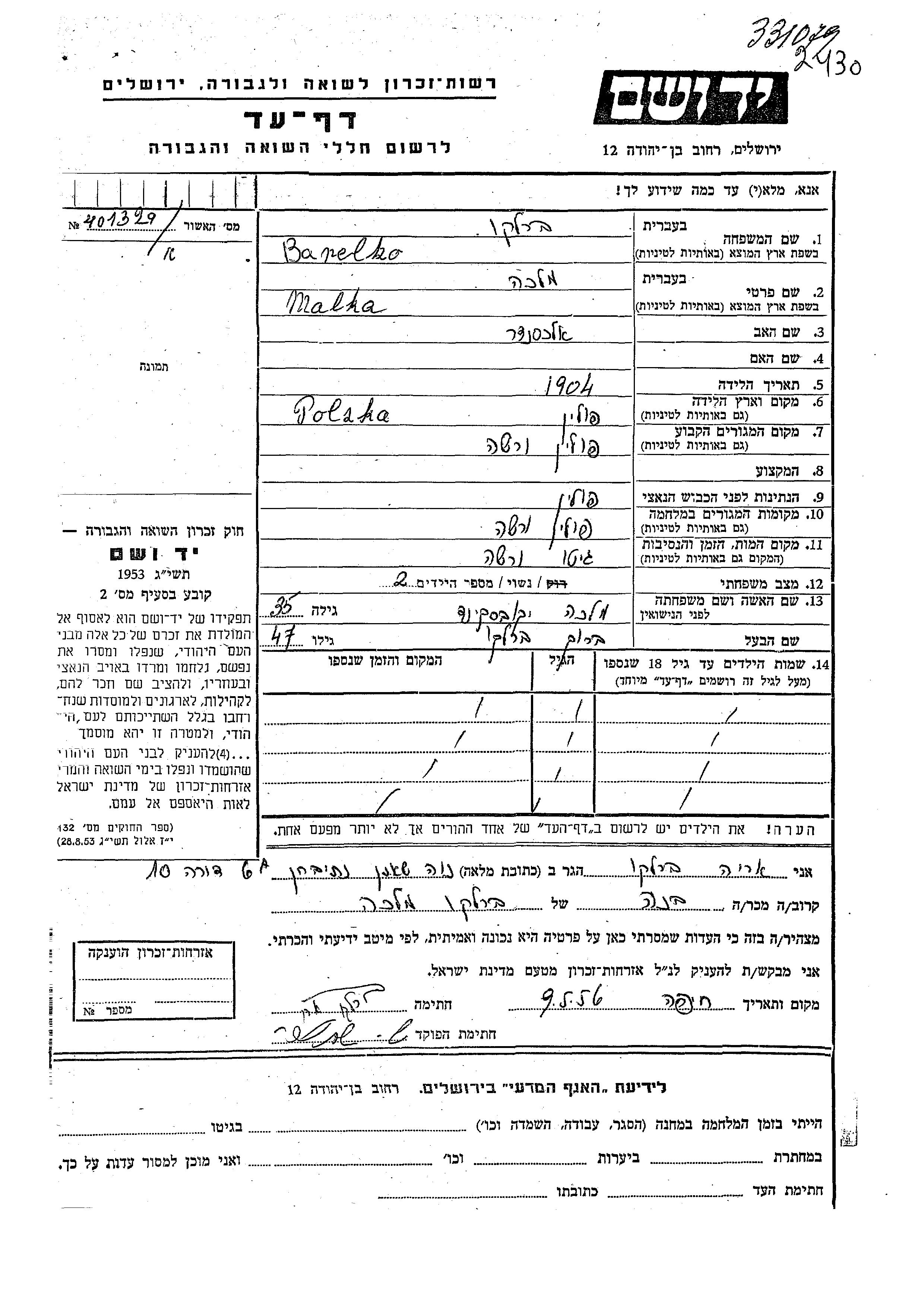Malka Barelko, geb. Iakobskind wurde im Jahr 1904 in Polen geboren. Sie war die Tochter von Aleksander. Sie war mit Barukh Verheiratet. Vor dem Zweiten Weltkrieg lebte sie in Warsaw, Polen. Während des Krieges war sie in Warsaw, Polen.
