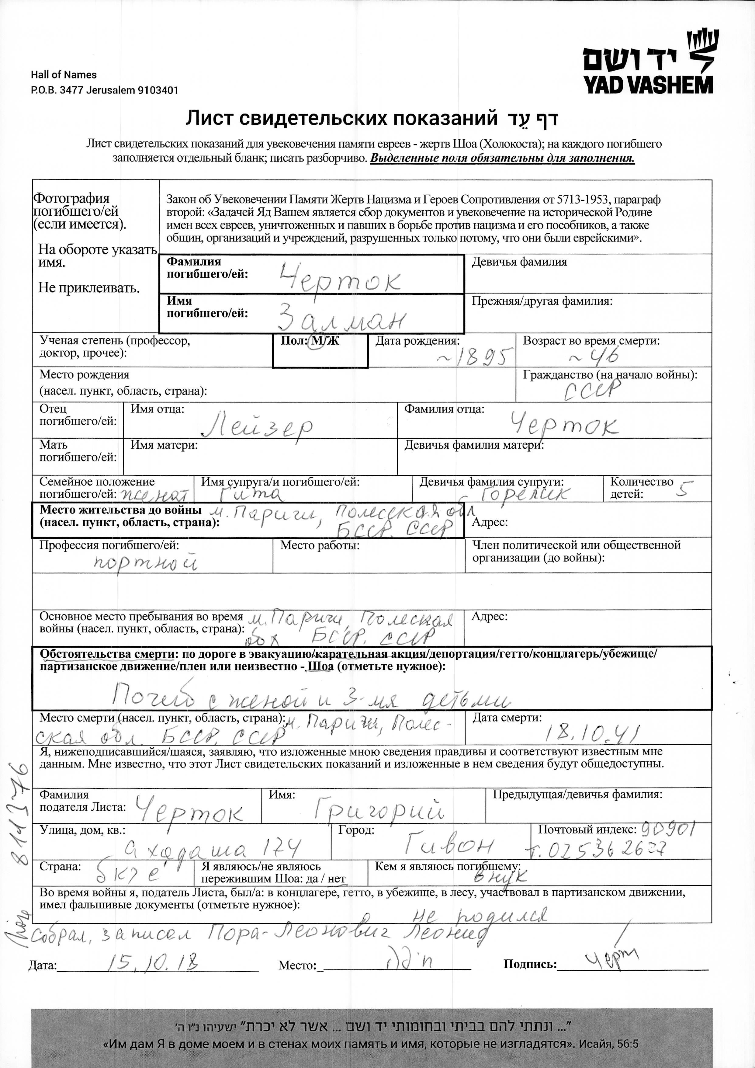 Zalman Chertok wurde im Jahr 1895 geboren. Er war der Sohn von Leyzer. Er war Schneider und mit Gita, geb. Gorelik Verheiratet. Vor dem Zweiten Weltkrieg lebte er in Parichi, Weißrussland (UdSSR). Während des Krieges war er in Parichi, Weißrussland (UdSSR).