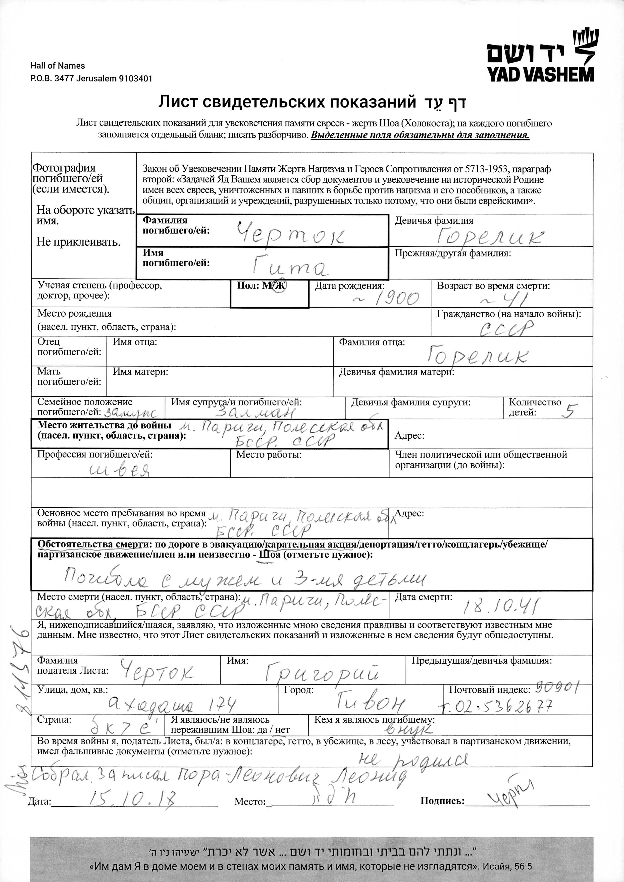 Gita Chertok, geb. Gorelik wurde im Jahr 1900 geboren. Sie war Shveya russian und mit Zalman Verheiratet. Vor dem Zweiten Weltkrieg lebte sie in Parichi, Weißrussland (UdSSR). Während des Krieges war sie in Parichi, Weißrussland (UdSSR).
