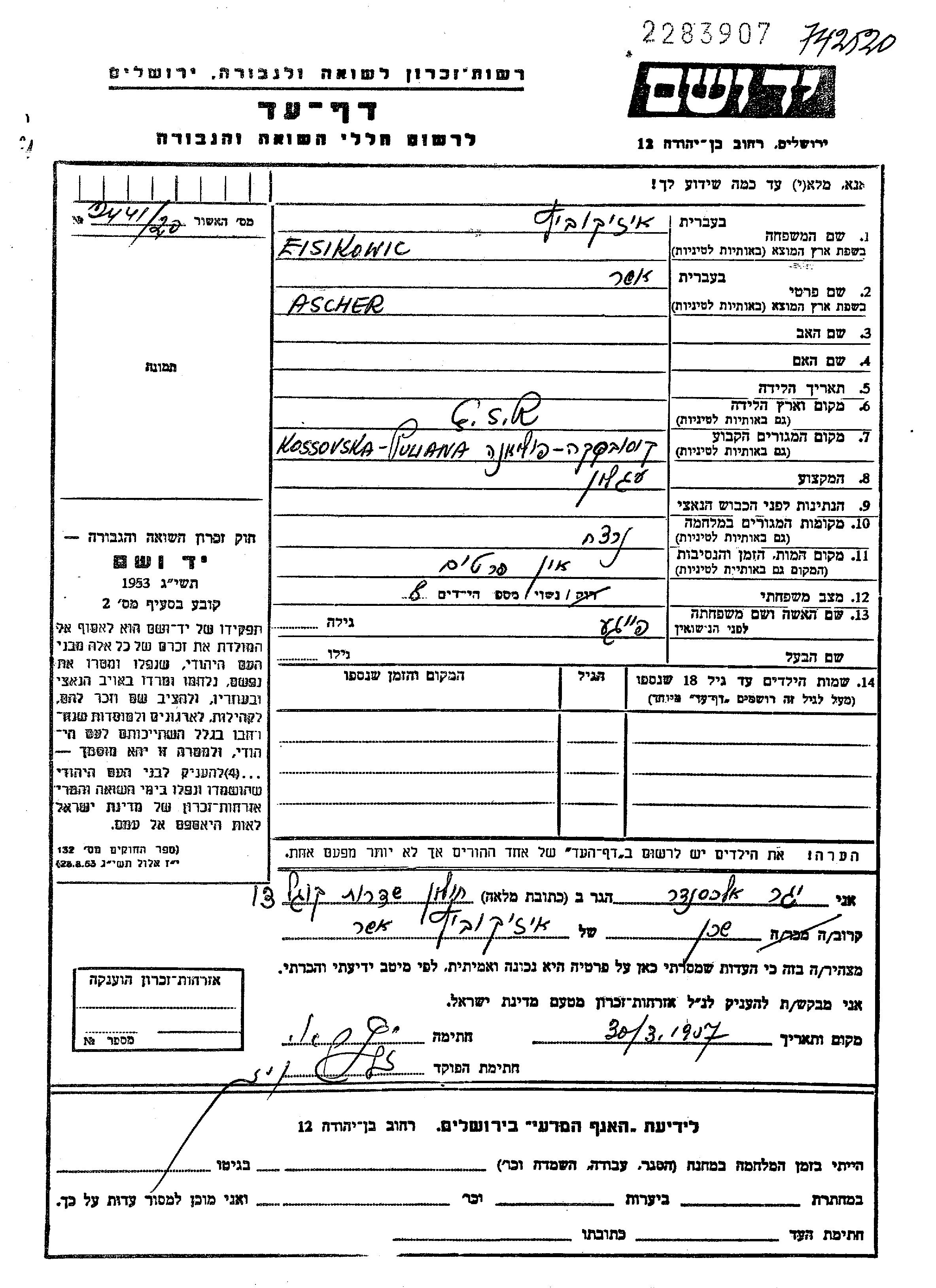 Asher wurde in der Schoah ermordet. Todesort: Kamenets Podolskiy, Ukraine (UdSSR) im Jahr 1941.