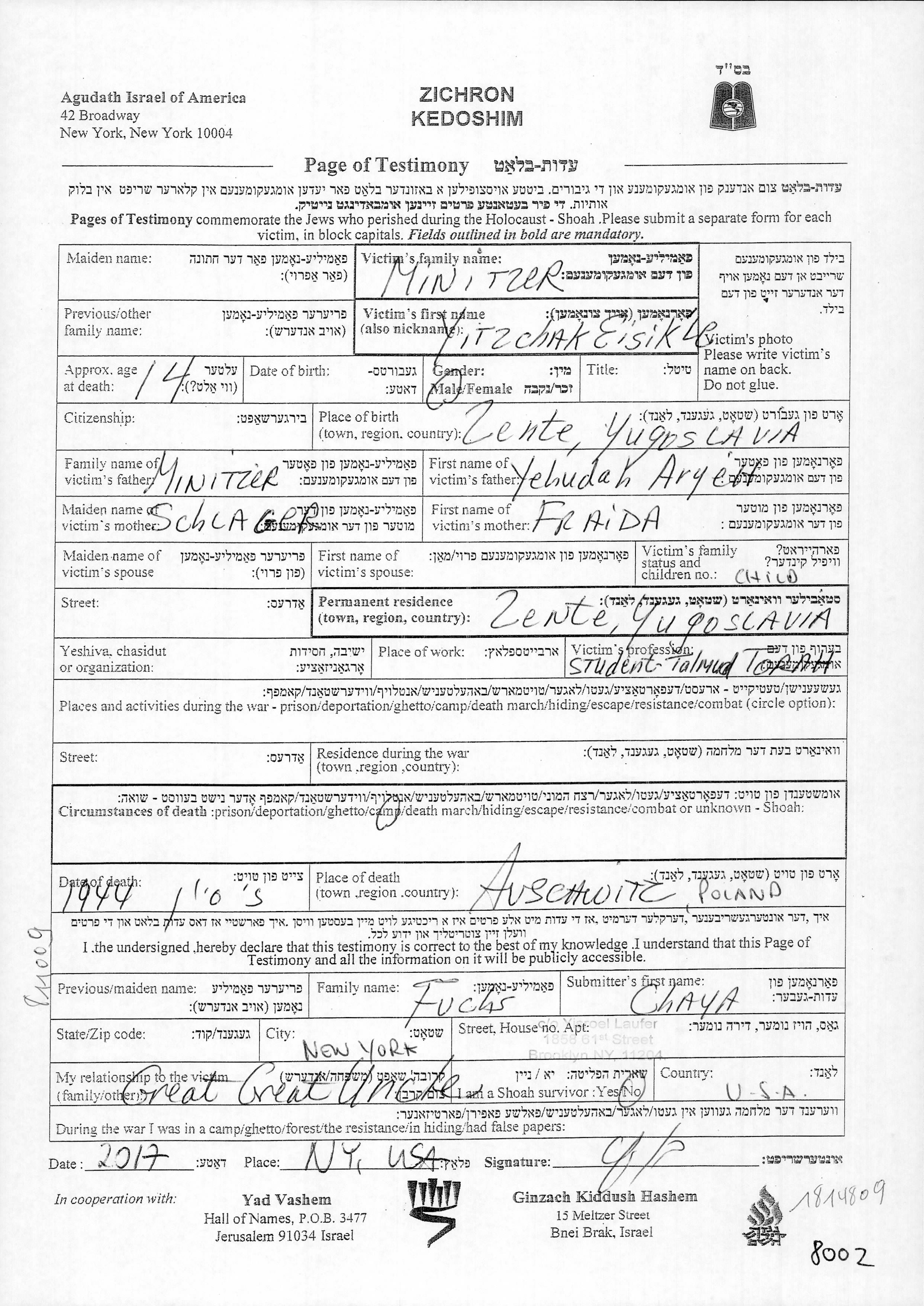 Yitzchak wurde in der Schoah ermordet. Todesort: Auschwitz, Polen im Jahr 30/05/1944.