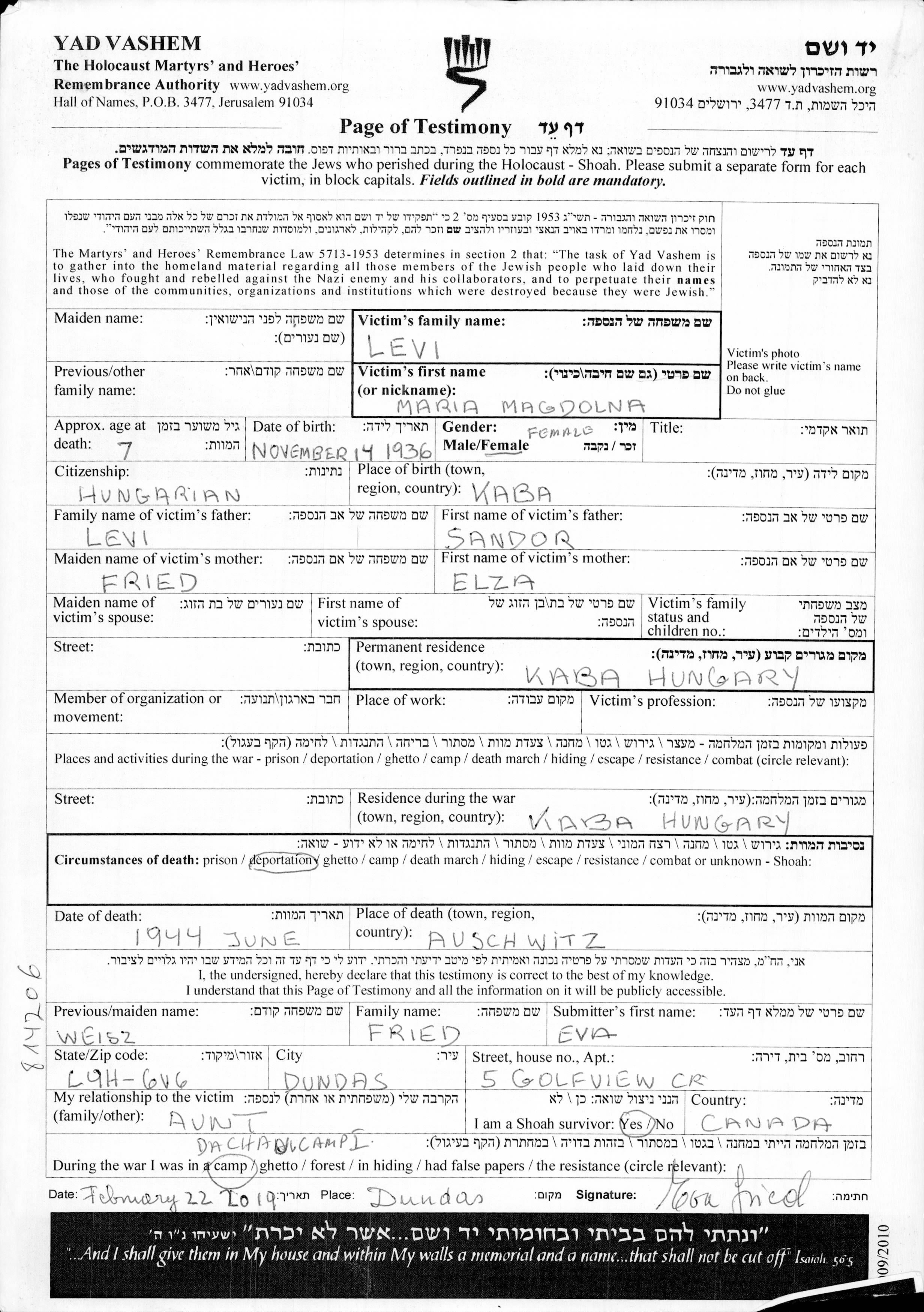 Mária Magdolna Levi wurde im Jahr 1936 in Kaba, Ungarn geboren. Sie war die Tochter von Sándor und Elza, geb. Fried. Sie war Kind. Vor dem Zweiten Weltkrieg lebte sie in Kaba, Ungarn. Während des Krieges war sie in Kaba, Ungarn.