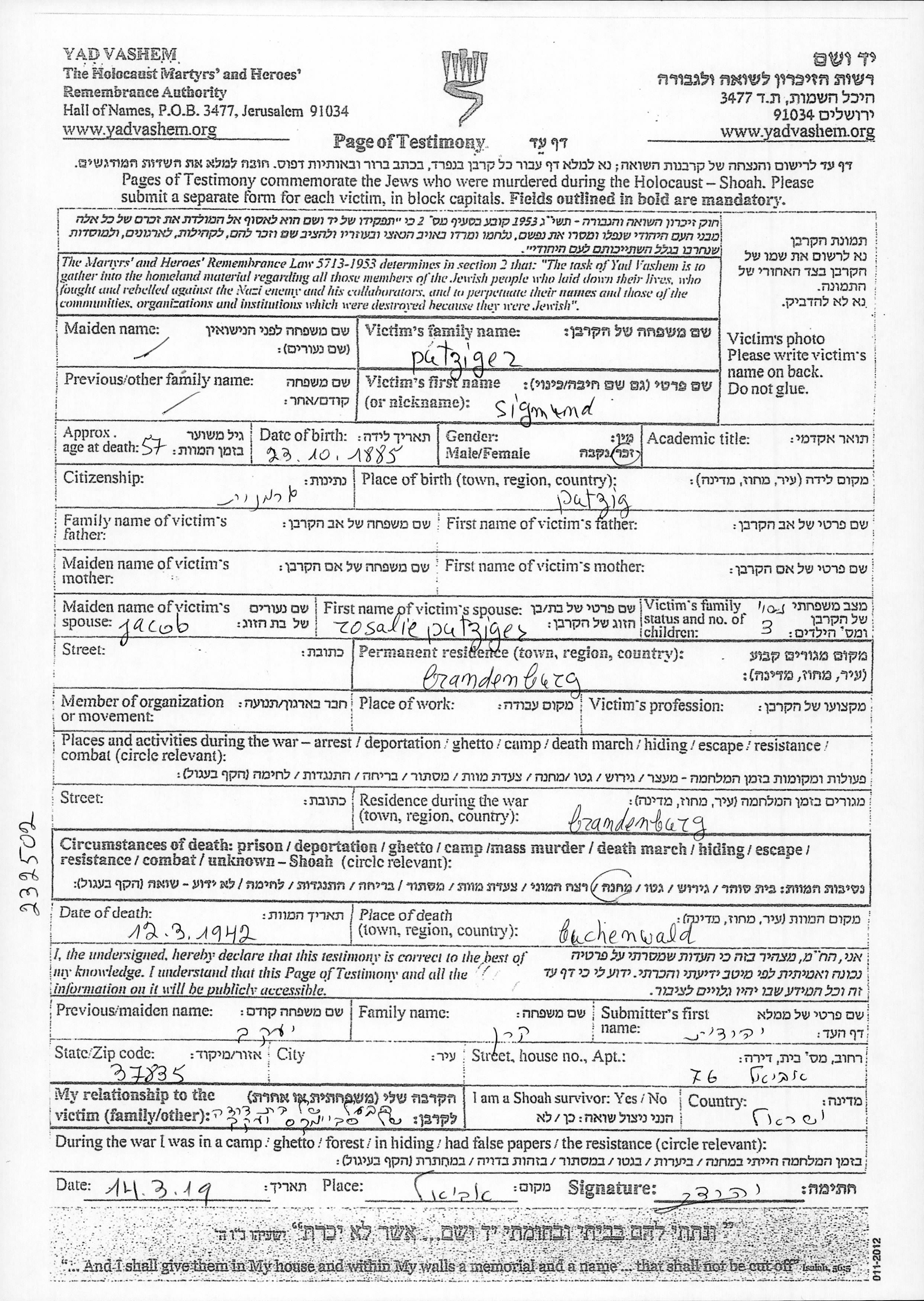 Sigmund wurde in der Schoah ermordet. Todesort: Buchenwald, Deutsches Reich im Jahr 12/03/1942.