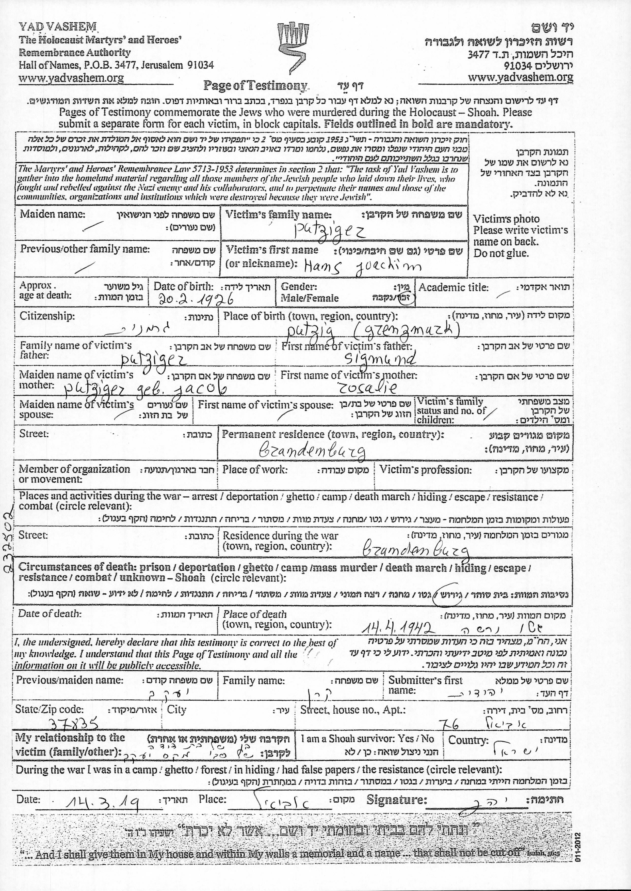 Hans Joachim Putziger wurde im Jahr 1926 in Putzig, Polen geboren. Er war der Sohn von Sigmund und Rosalie, geb. Jacob. Er war Kind. Vor dem Zweiten Weltkrieg lebte er in Brandenburg, Deutsches Reich. Während des Krieges war er in Brandenburg, Deutsches Reich.
