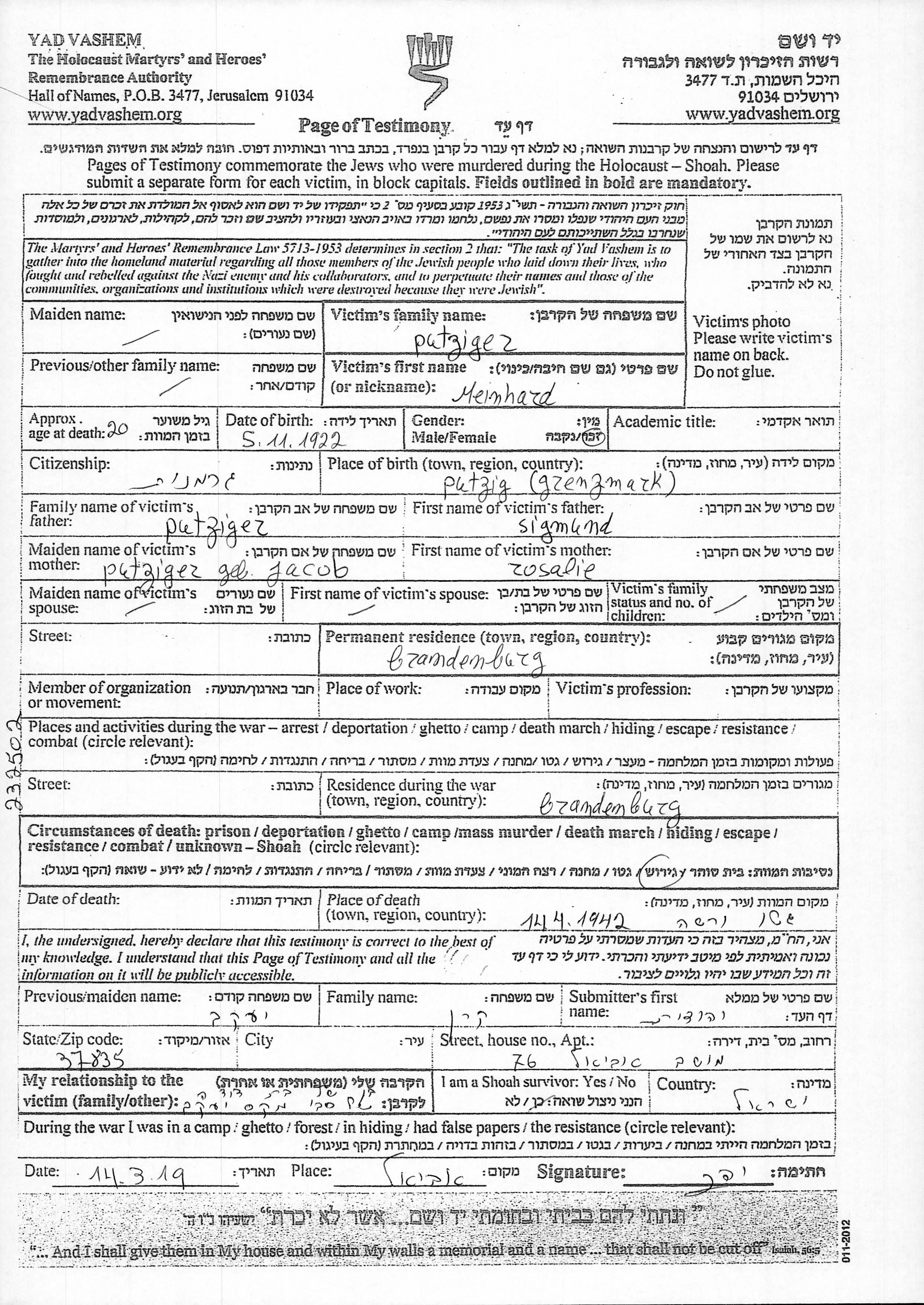 Meinhard Putziger wurde im Jahr 1922 in Putzig, Polen geboren. Er war der Sohn von Sigmund und Rosalie, geb. Jacob. Vor dem Zweiten Weltkrieg lebte er in Brandenburg, Deutsches Reich. Während des Krieges war er in Brandenburg, Deutsches Reich.