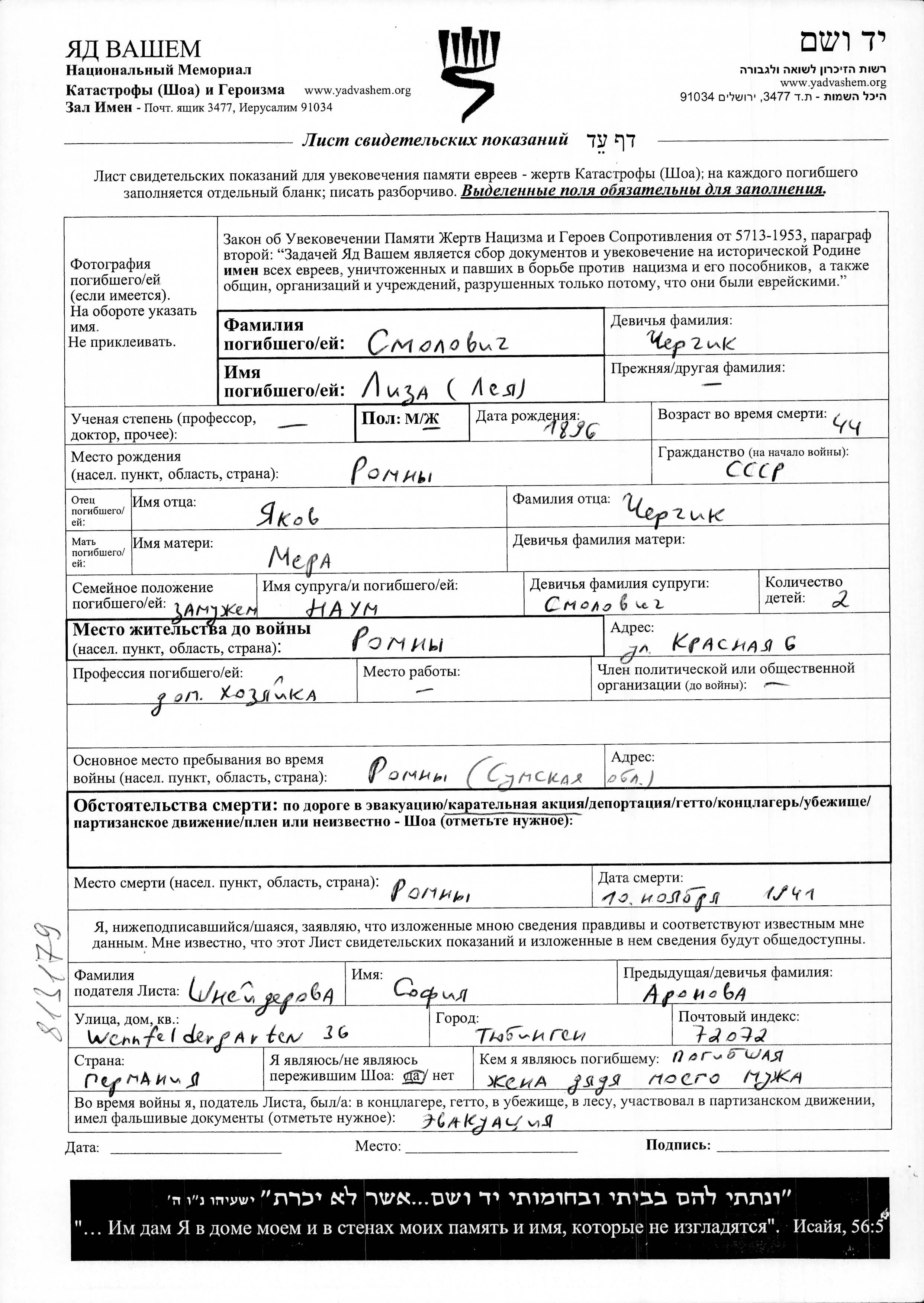Liza Leya Smolovich, geb. Cherchik wurde im Jahr 1896 in Romny, Ukraine (UdSSR) geboren. Sie war die Tochter von Yakov und Mera. Sie war Hausfrau und mit Naum Verheiratet. Vor dem Zweiten Weltkrieg lebte sie in Romny, Ukraine (UdSSR). Während des Krieges war sie in Romny, Ukraine (UdSSR).