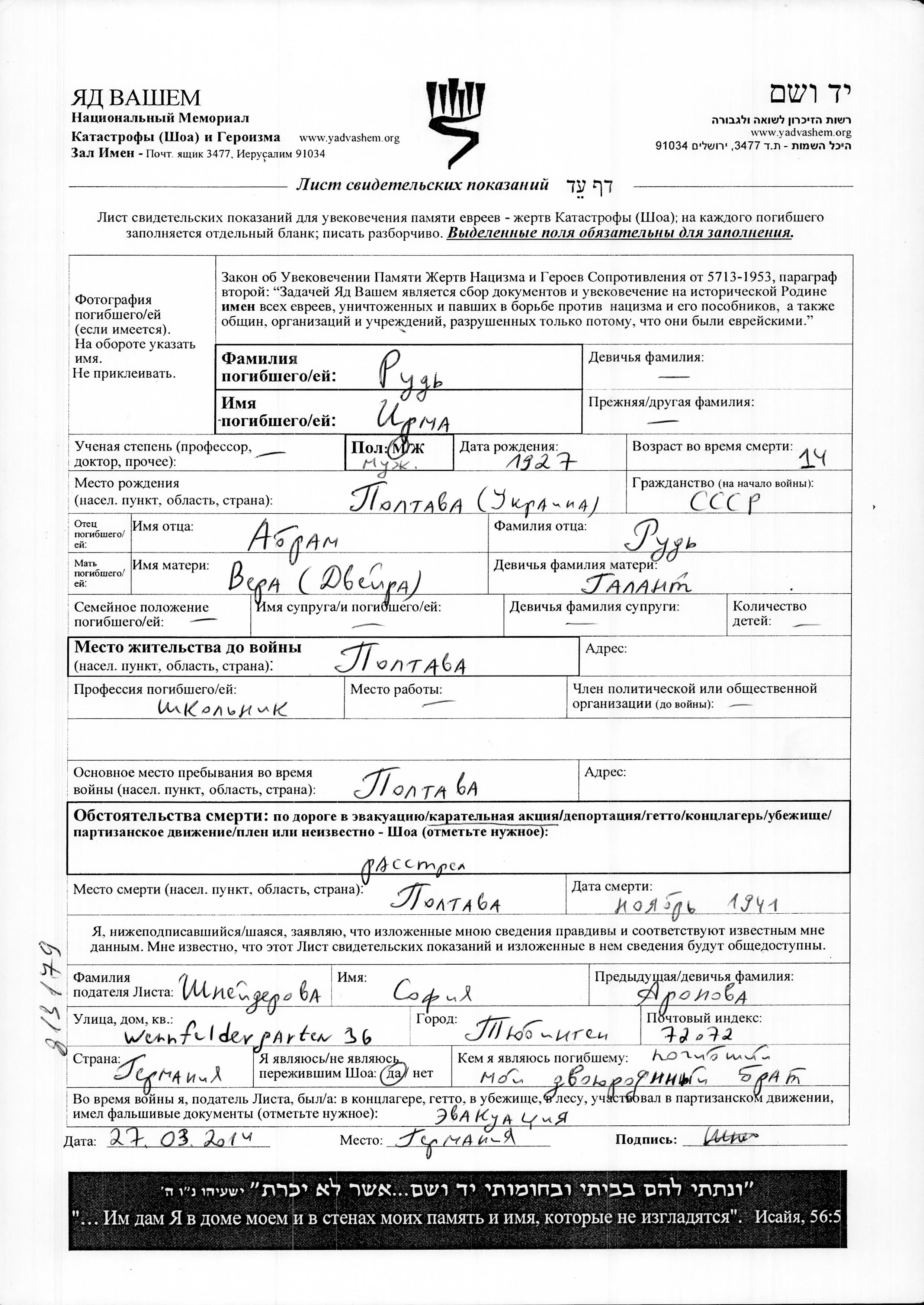 Irma Rud wurde im Jahr 1927 in Poltava, Ukraine (UdSSR) geboren. Er war der Sohn von Abram und Vera Dveyra, geb. Galant. Er war Schüler/-in und Kind. Vor dem Zweiten Weltkrieg lebte er in Poltava, Ukraine (UdSSR). Während des Krieges war er in Poltava, Ukraine (UdSSR).