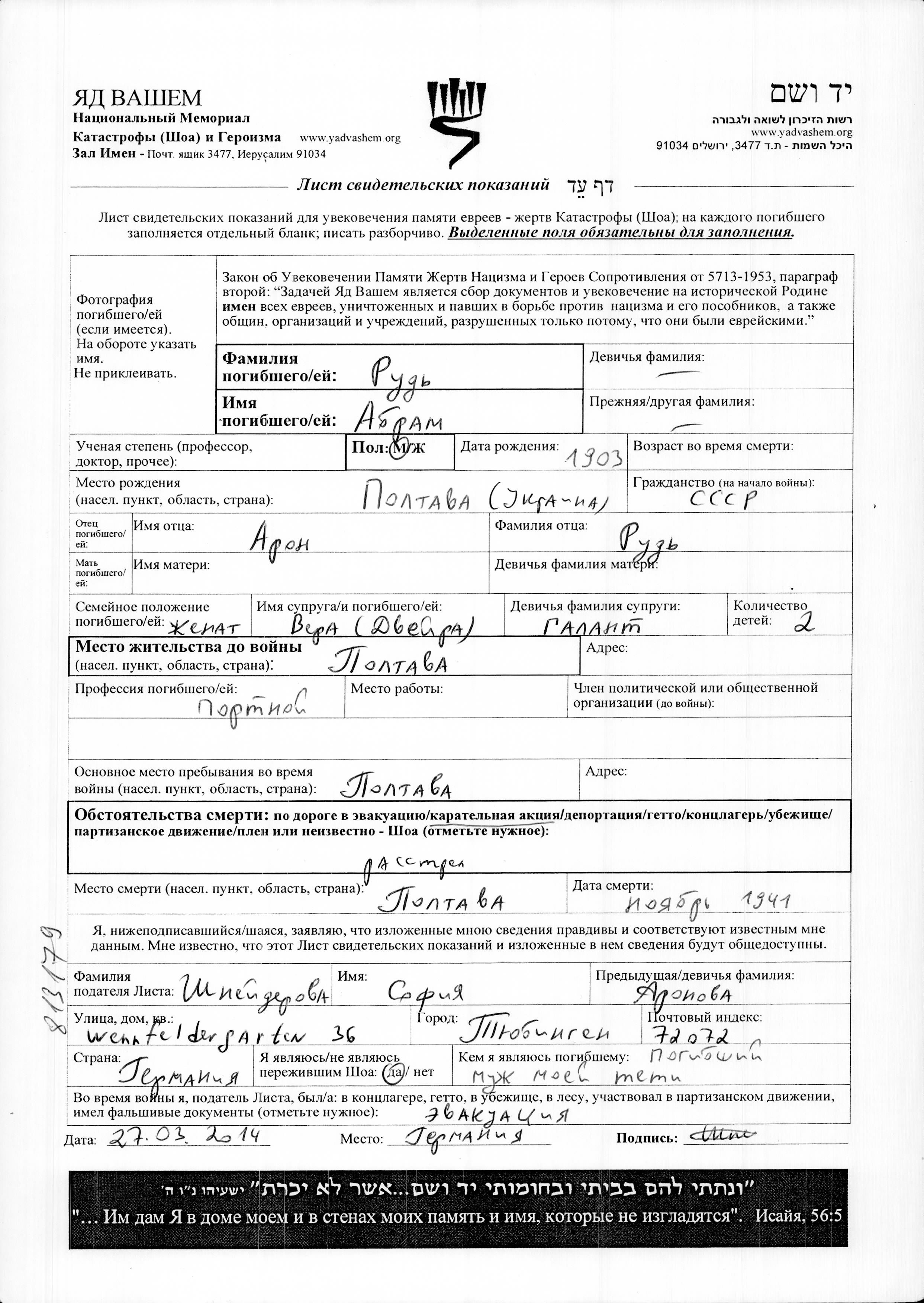 Abram wurde in der Schoah ermordet. Todesort: Poltava, Ukraine (UdSSR) im Jahr 11/1941.