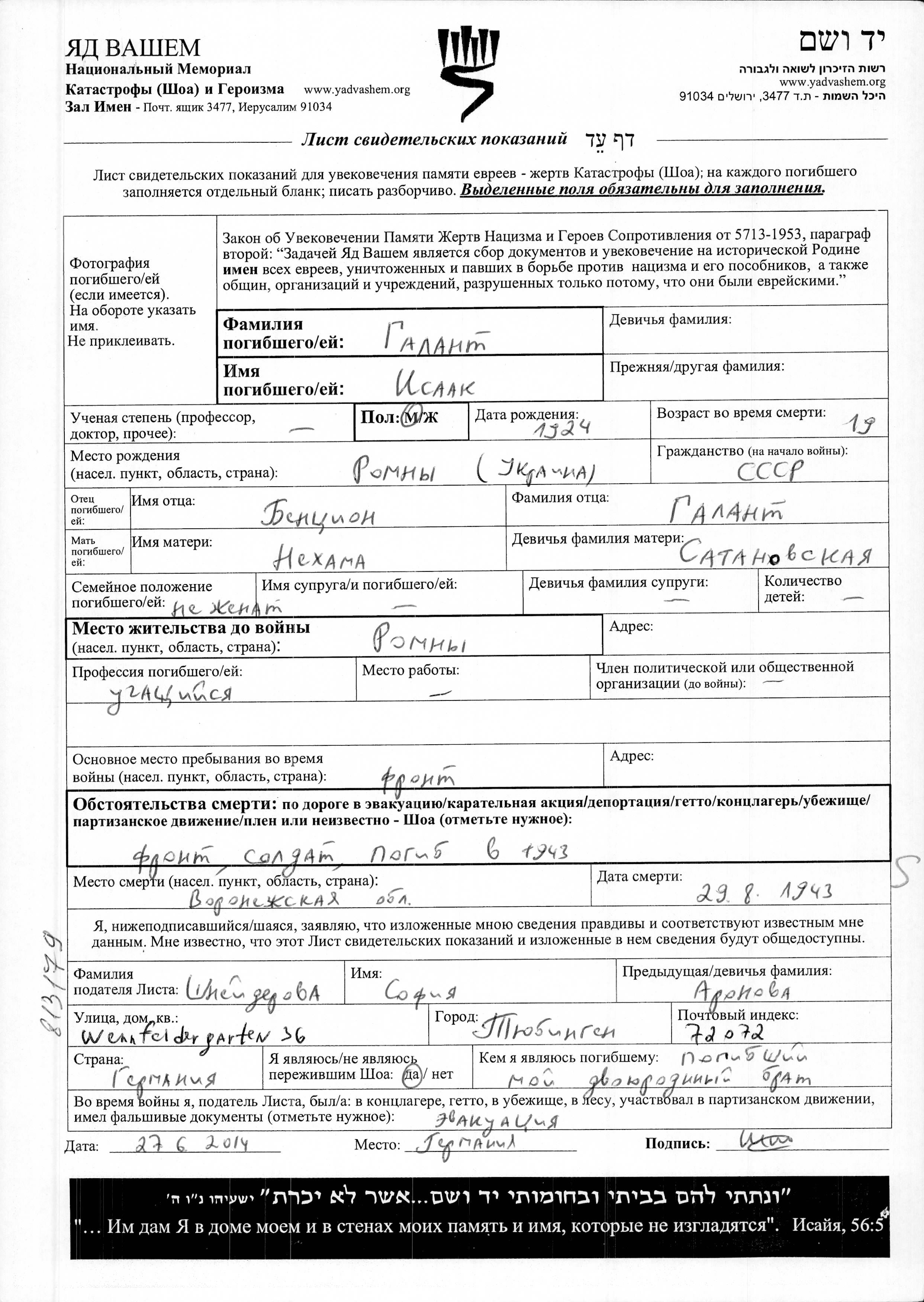 Isaak Galant wurde im Jahr 1924 in Romny, Ukraine (UdSSR) geboren. Er war der Sohn von Bentzion und Nekhama, geb. Satanovskaya. Er war Schüler/-in und Ledig. Vor dem Zweiten Weltkrieg lebte er in Romny, Ukraine (UdSSR). Während des Krieges war er in die Sowjetischen Streitkräfte. Isaak im Militärdienst umgekommen. Todesort: Voronezh, Russland (UdSSR) im Jahr 29/08/1943.