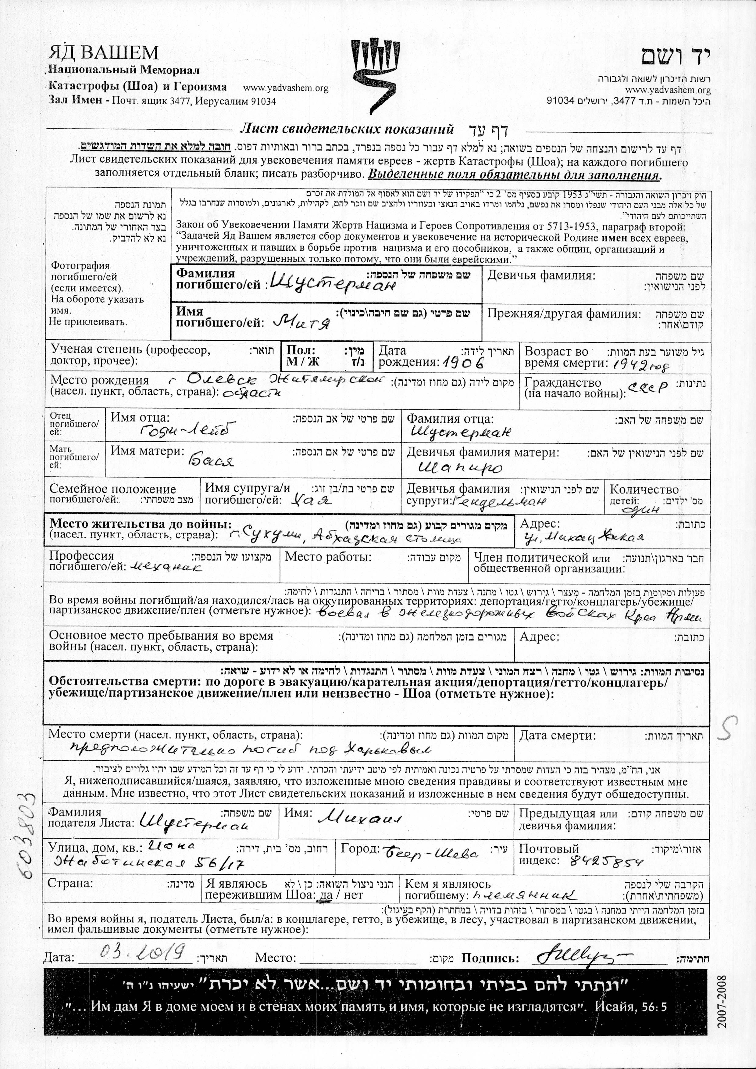 Mitya Shusterman wurde im Jahr 1906 in Olevsk, Ukraine (UdSSR) geboren. Er war der Sohn von Godi Leyb und Basya, geb. Shapiro. Er war mit Khaya, geb. Gendelman Verheiratet. Vor dem Zweiten Weltkrieg lebte er in Sukhumi, Georgien (UdSSR). Während des Krieges war er in die Sowjetischen Streitkräfte.