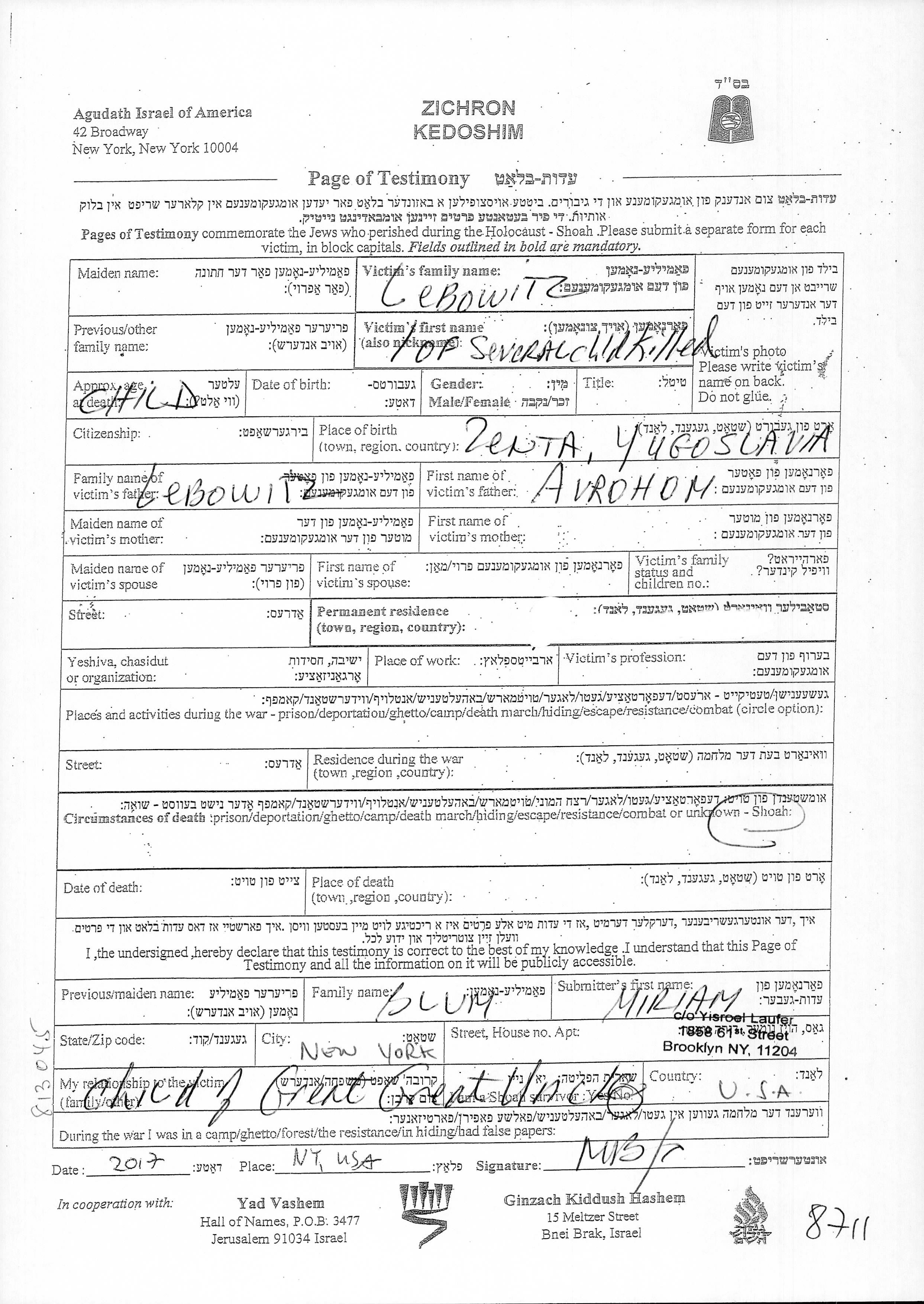 Vorname unbekannt Lebowitz wurde in Zenta, Jugoslawien geboren. Er/sie war der/ die Sohn/Tochter von Avrohom. Er/Sie war Kind.