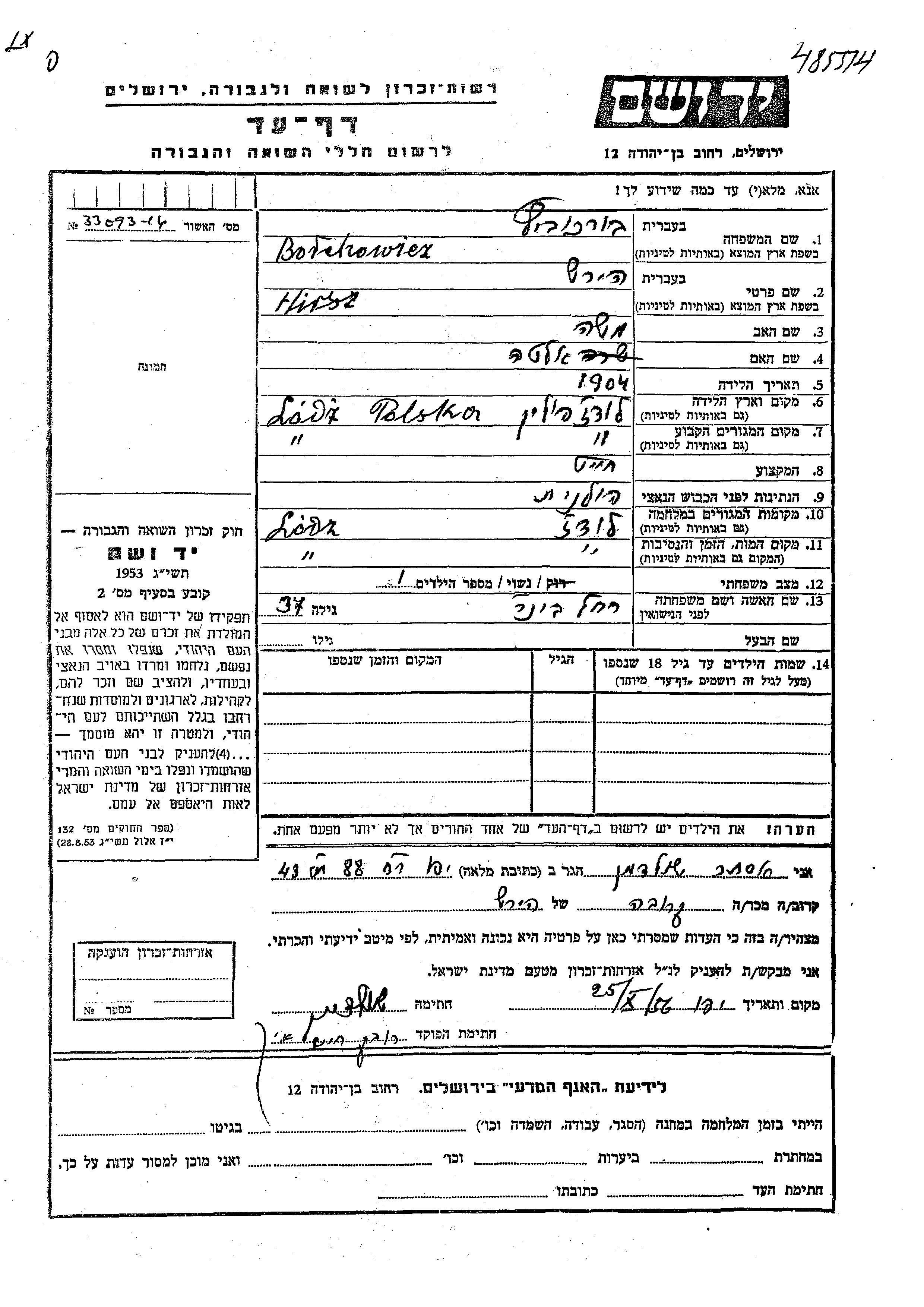 Hirsz wurde in der Schoah ermordet. Todesort: Lodz, Polen.