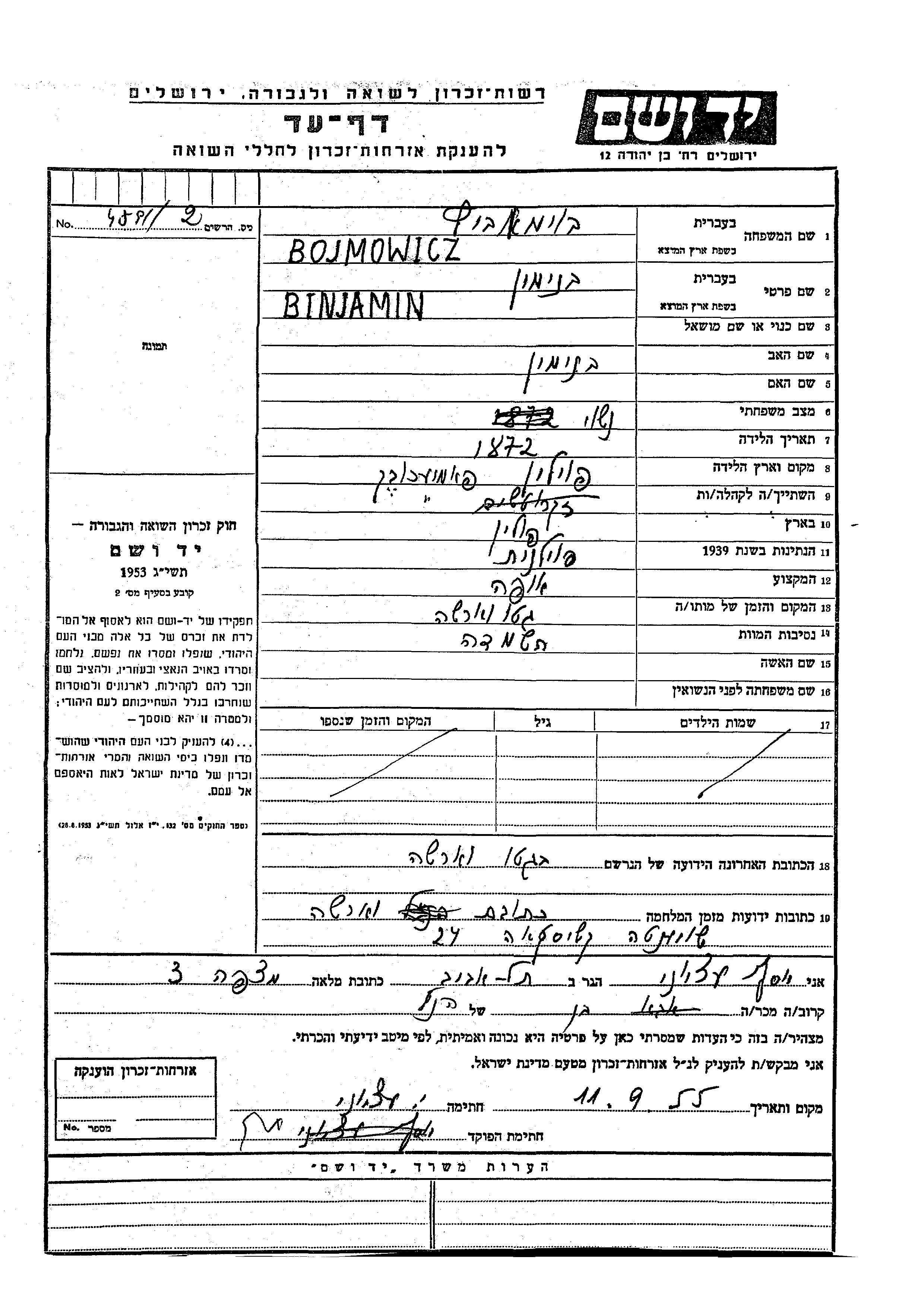 Binjamin Bojmowicz wurde im Jahr 1872 in Pomiechowek, Polen geboren. Er war der Sohn von Beniamin. Er war Bäcker/-in und Verheiratet. Vor dem Zweiten Weltkrieg lebte er in Pomiechowek, Polen. Während des Krieges war er in Varsha, Polen.