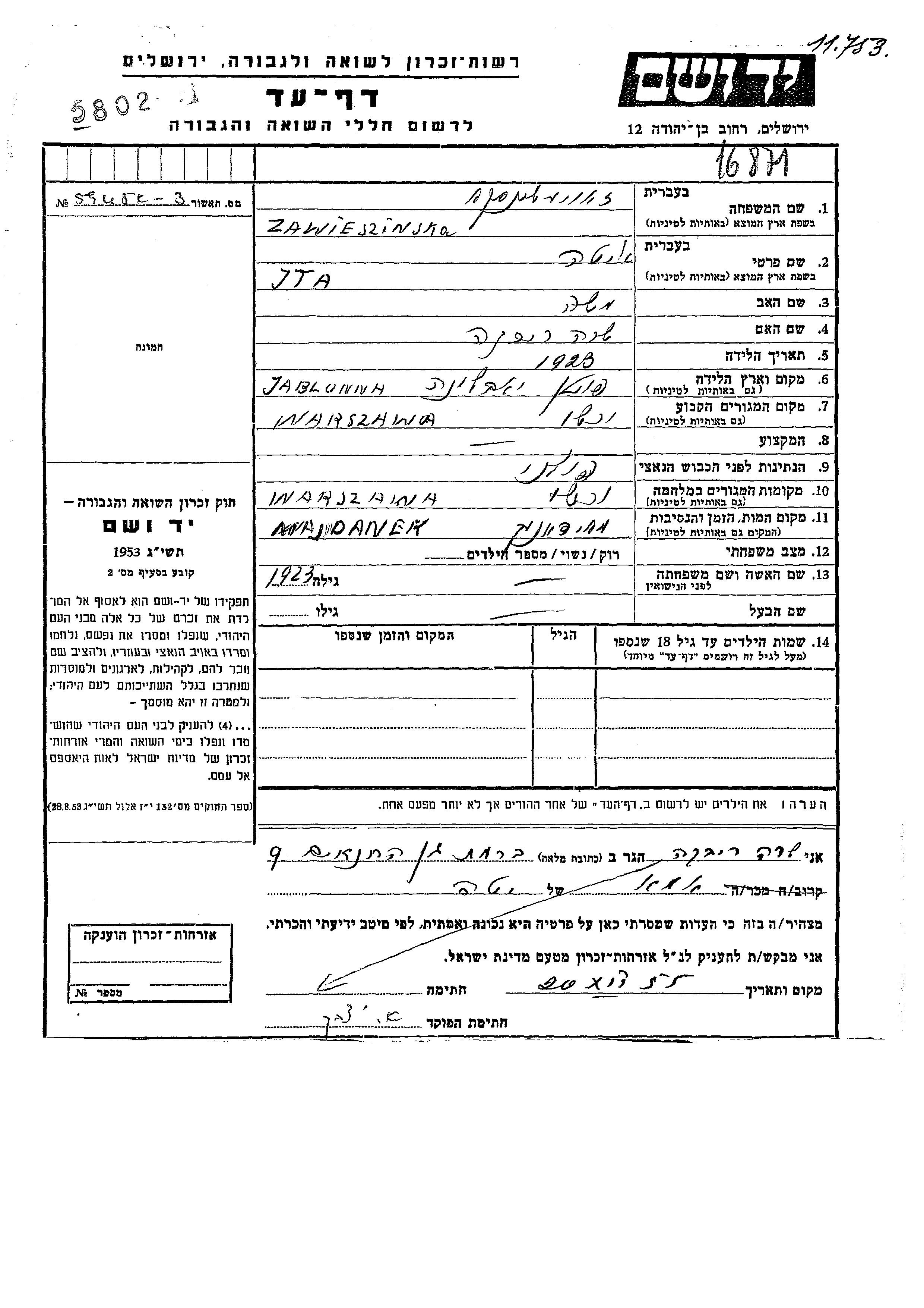 Ita Zawieszinska Zavieshinska wurde im Jahr 1923 in Jablonna, Polen geboren. Sie war die Tochter von Moshe und Sara Rivka. Vor dem Zweiten Weltkrieg lebte sie in Warsaw, Polen. Während des Krieges war sie in Warsaw, Polen.