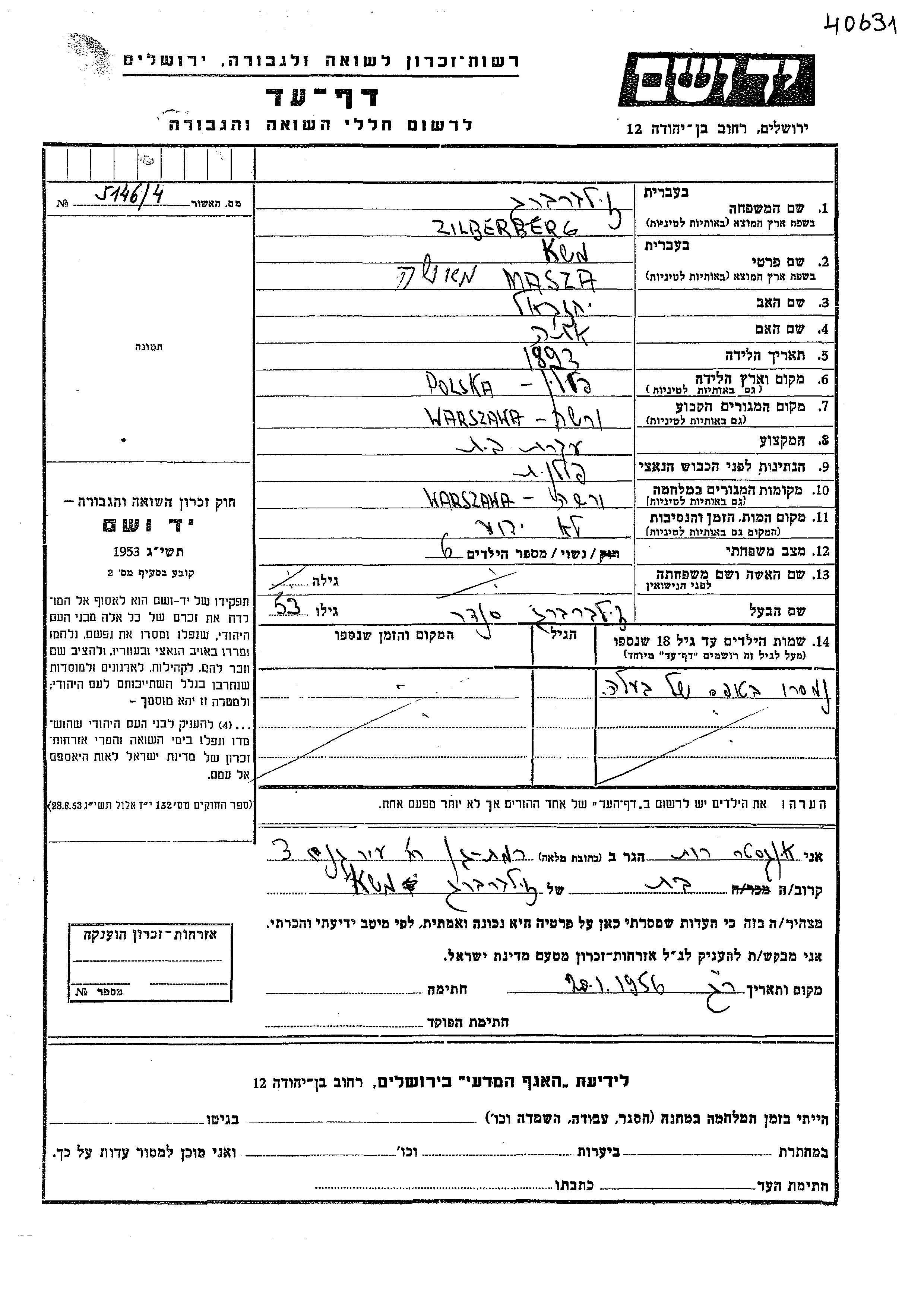 Masza Zilberberg wurde im Jahr 1893 in Polen geboren. Sie war die Tochter von Yekhezkel. Sie war Hausfrau und mit Sender Verheiratet. Vor dem Zweiten Weltkrieg lebte sie in Warsaw, Polen. Während des Krieges war sie in Warsaw, Polen.