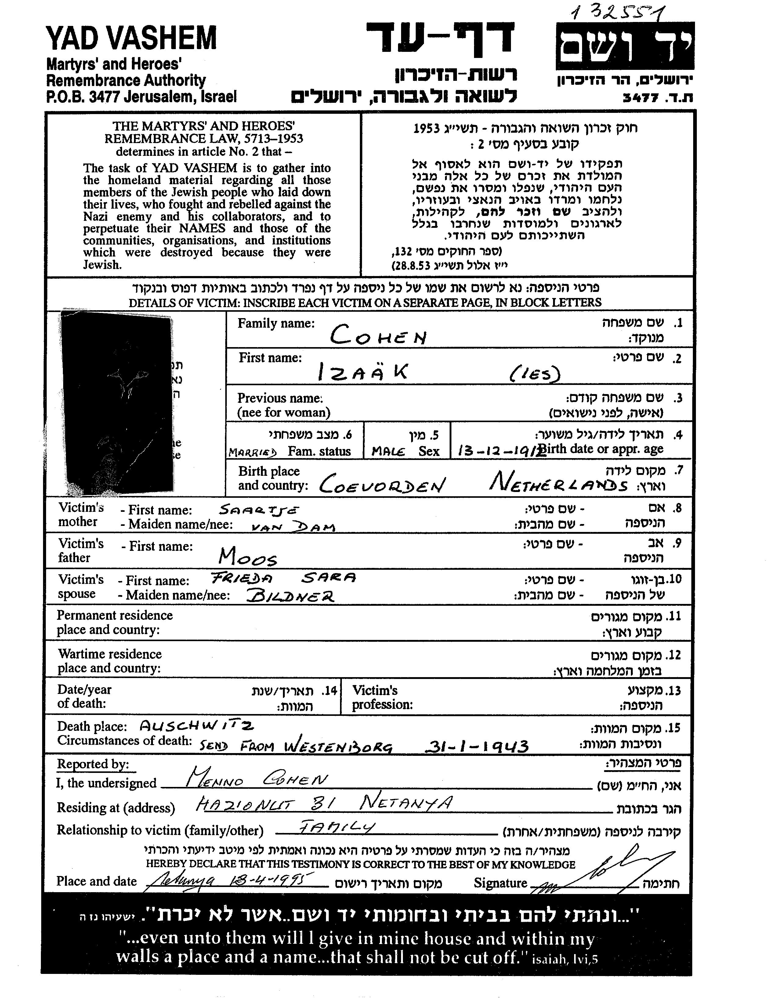 Cohen Izaak 1912 Enschede, Niederlande Gedenkblatt