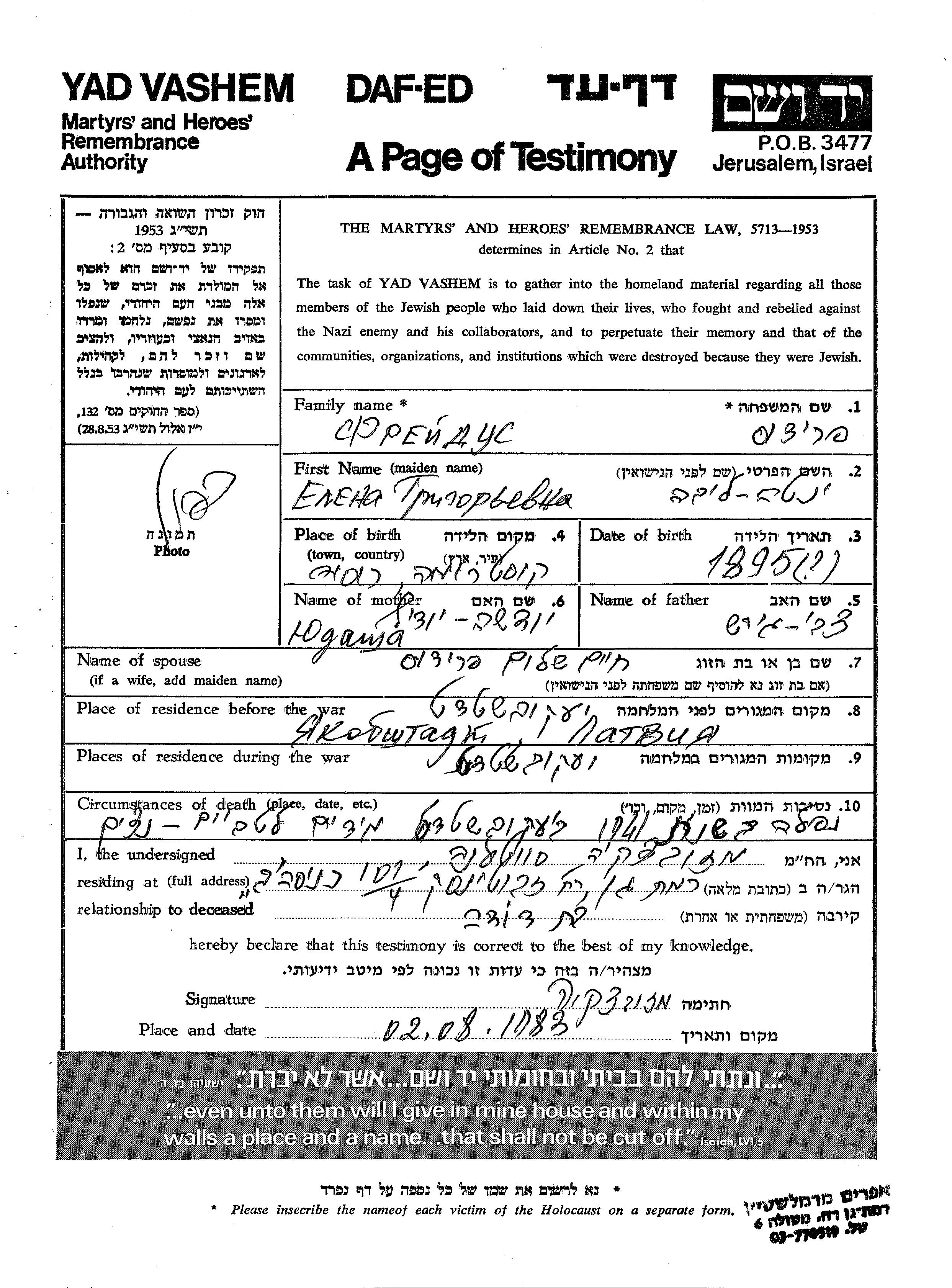 Lena Yenta Liba wurde in der Schoah ermordet. Todesort: unbekannt im Jahr 1941.