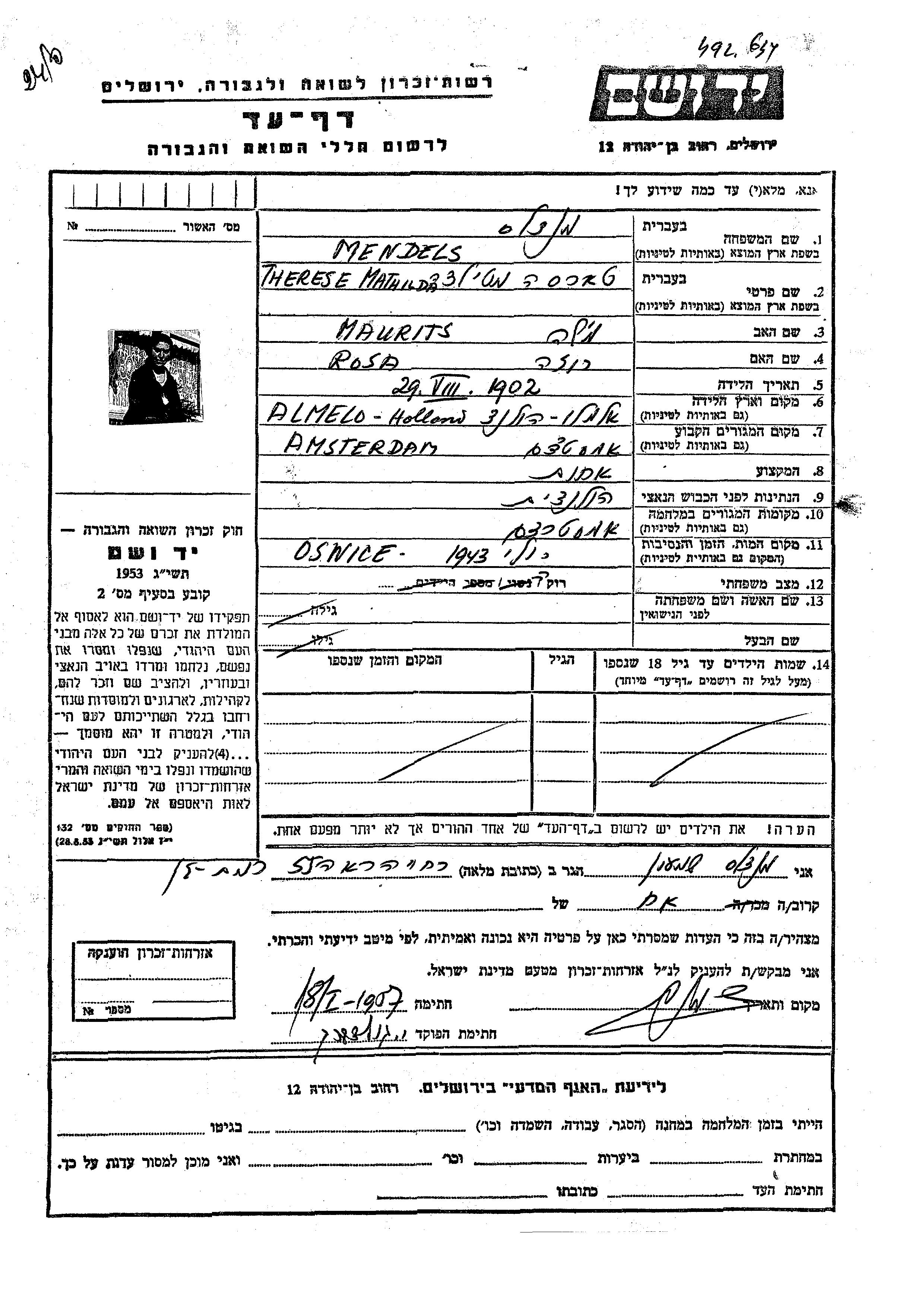 Mendels Therese Mathilda 1902 Amsterdam, Niederlande Gedenkblatt