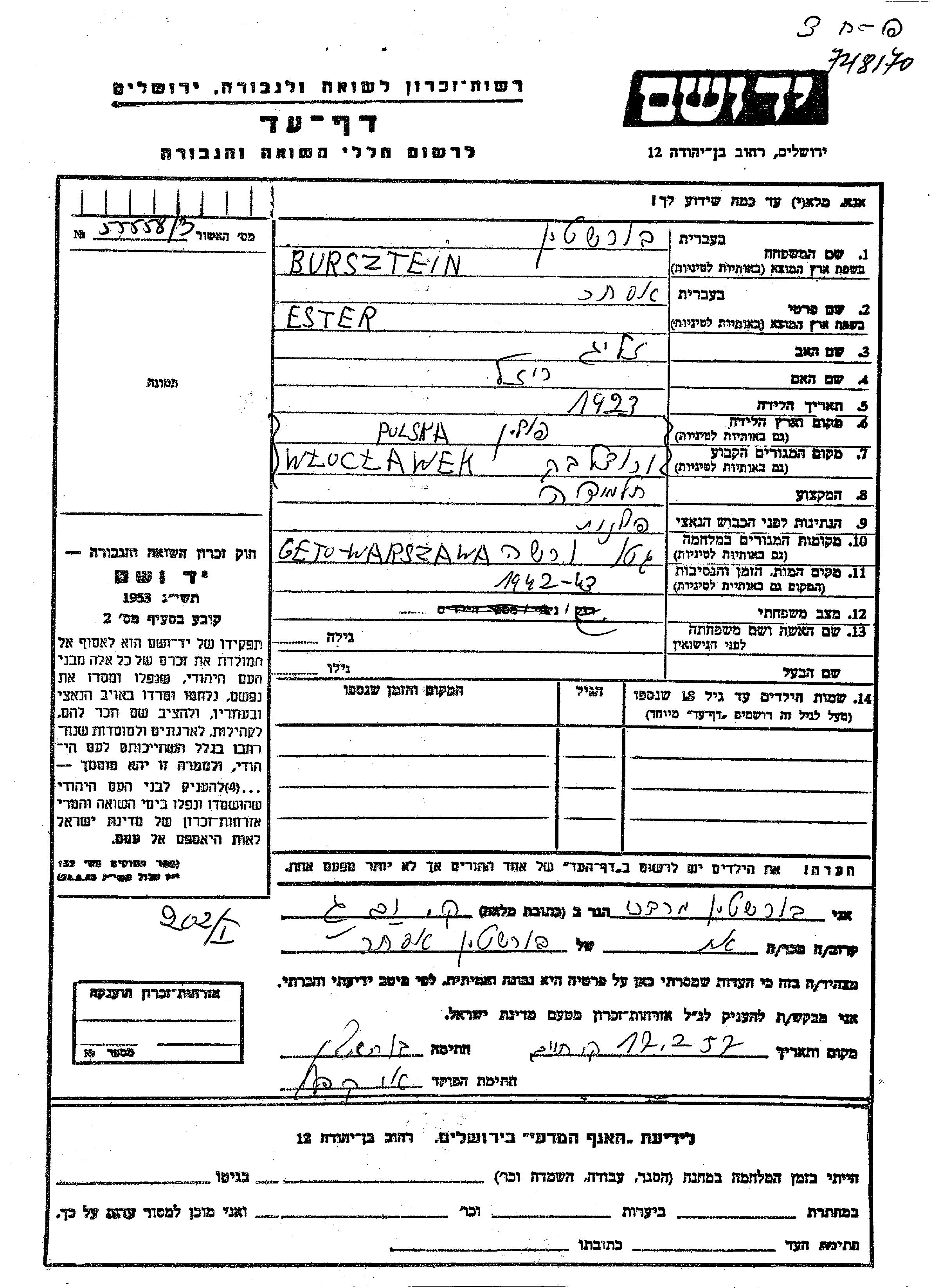 Ester Bursztein wurde im Jahr 1923 in Wloclawek, Polen geboren. Sie war Schüler/-in. Vor dem Zweiten Weltkrieg lebte sie in Wloclawek, Polen.