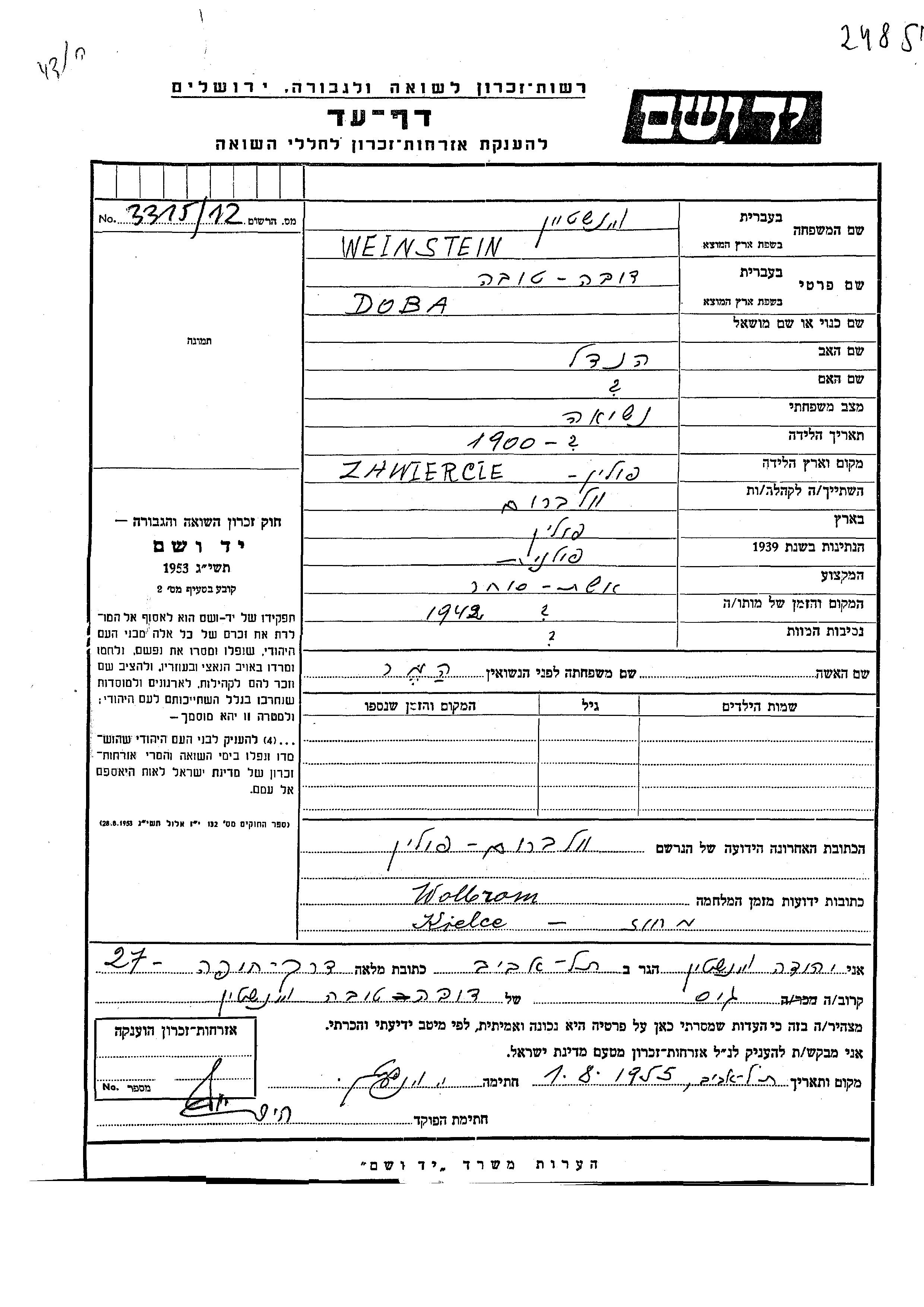 Doba Tova Weinstein wurde im Jahr 1900 in Zawiercie, Polen geboren. Sie war die Tochter von Hendel. Sie war Verheiratet. Vor dem Zweiten Weltkrieg lebte sie in Wolbrom, Polen. Während des Krieges war sie in Wolbrom, Polen.