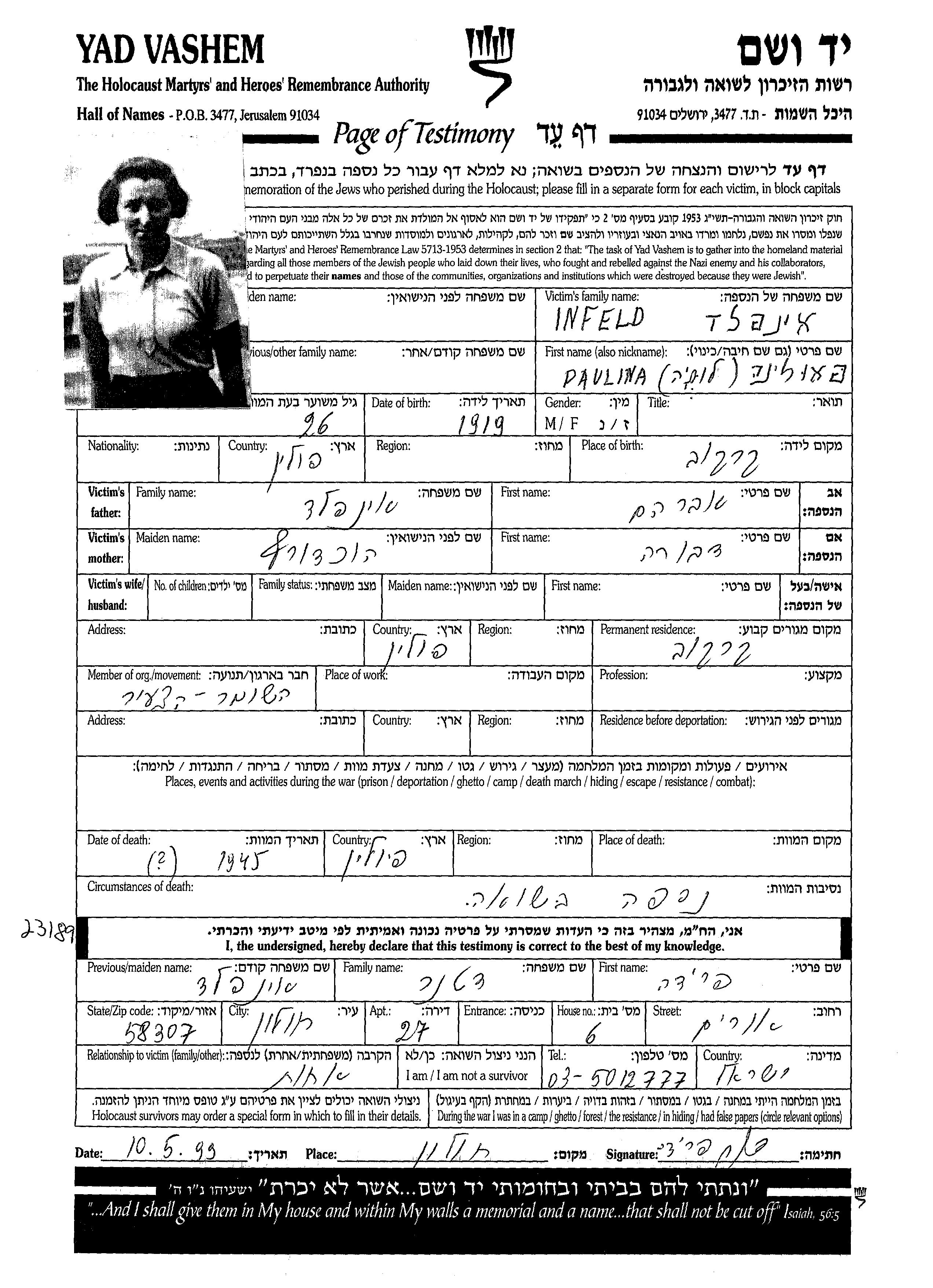 Paulina Lusia Infeld wurde im Jahr 1919 in Krakow, Polen geboren. Sie war Schneiderin. Vor dem Zweiten Weltkrieg lebte sie in Krakow, Polen.