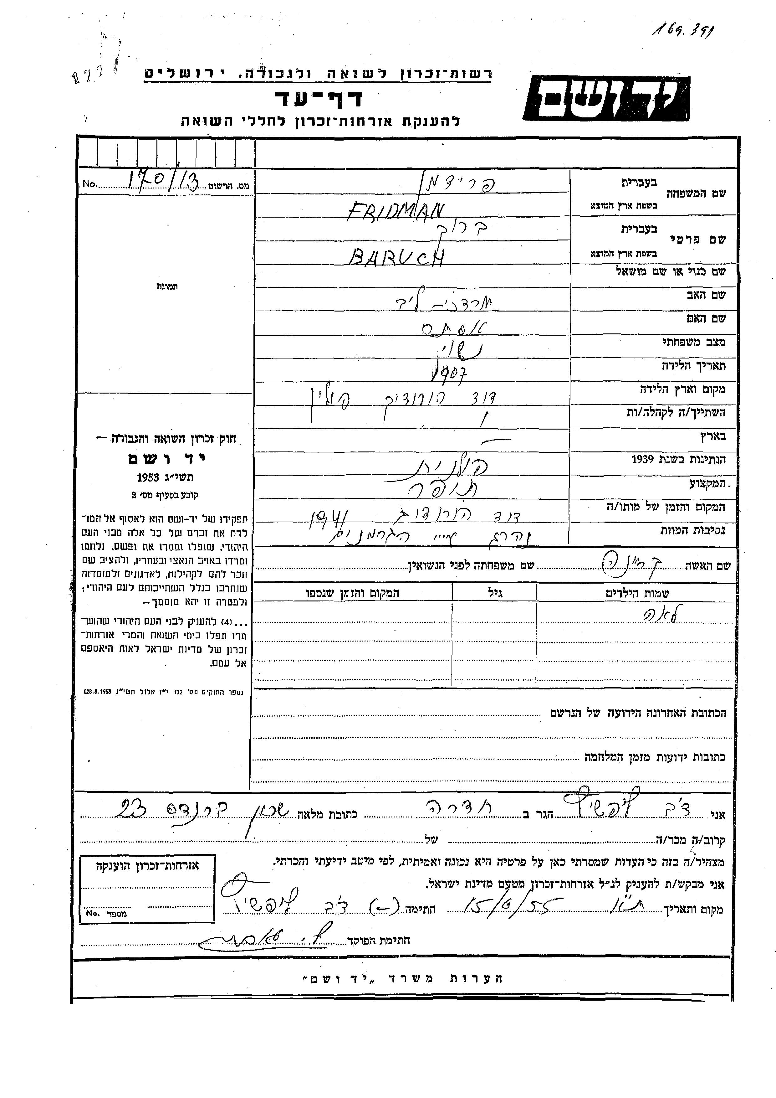 Barukh wurde in der Schoah ermordet. Todesort: Dawidgrodek, Polen im Jahr 1941.