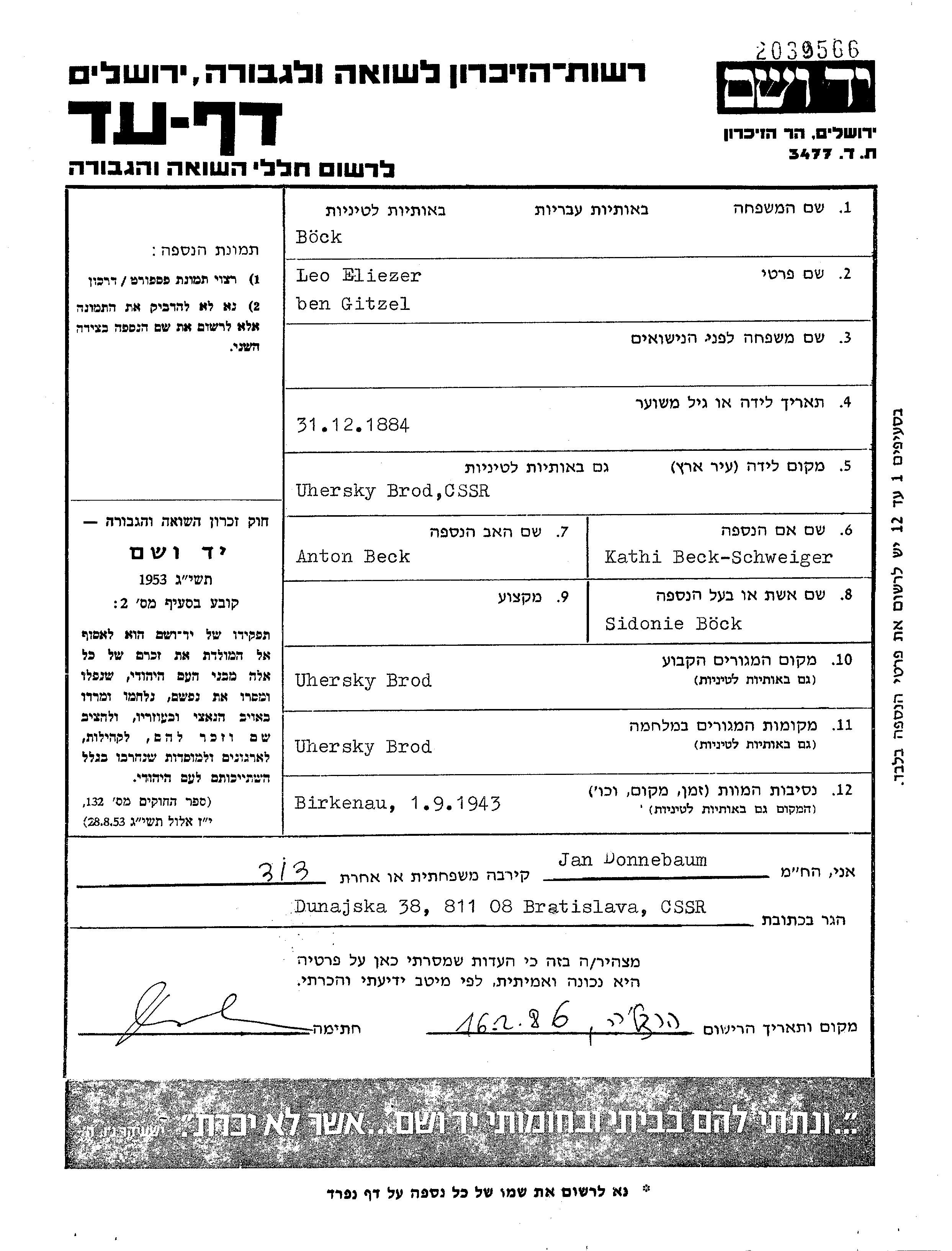 Boeck Leo 1885 Ungarisch Brod, Tschechoslowakei Liste von in Auschwitz ermordeten Juden