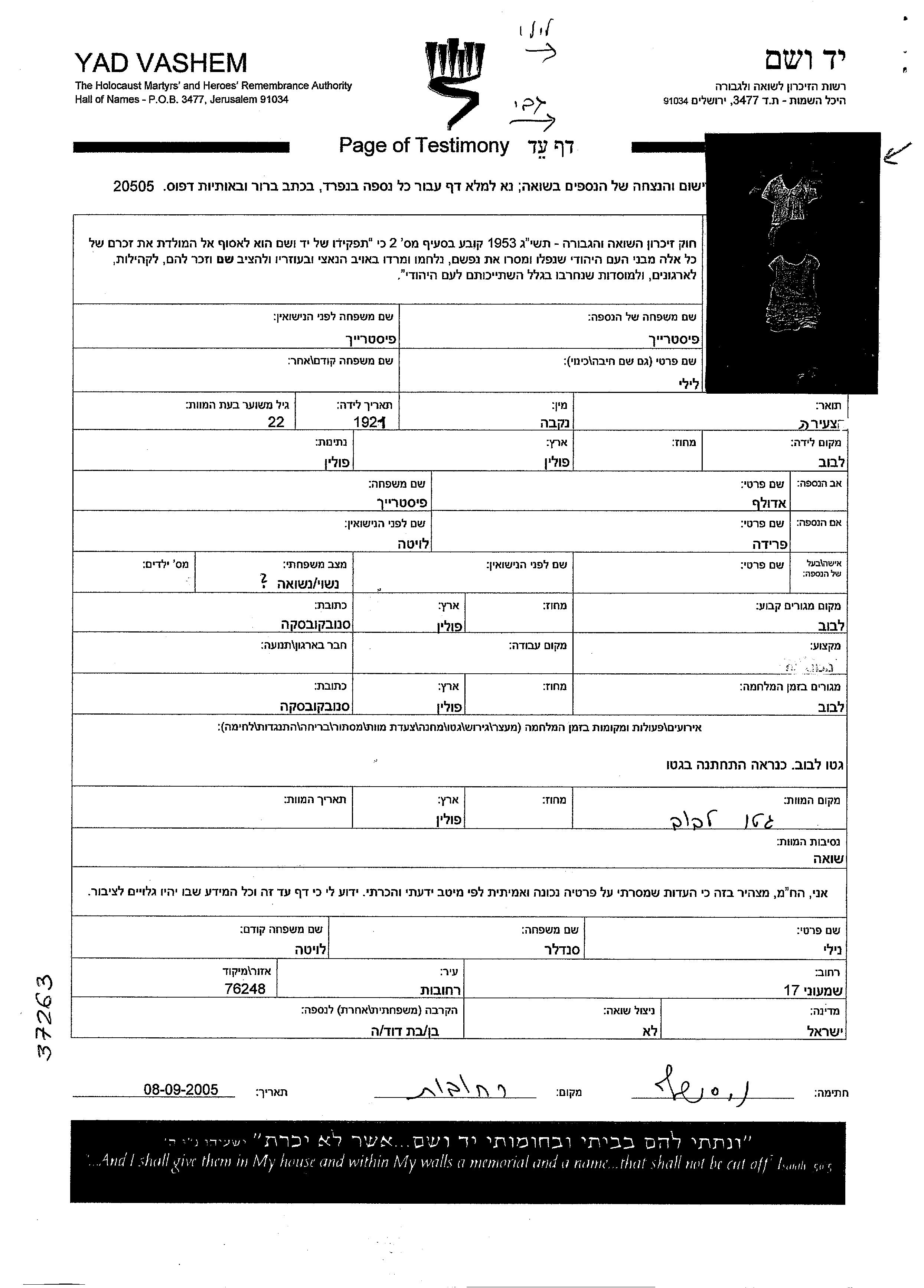 Lili Pistraich, geb. Pistreikh wurde im Jahr 1921 in Lwow, Polen geboren. Vor dem Zweiten Weltkrieg lebte sie in Lwow, Polen.