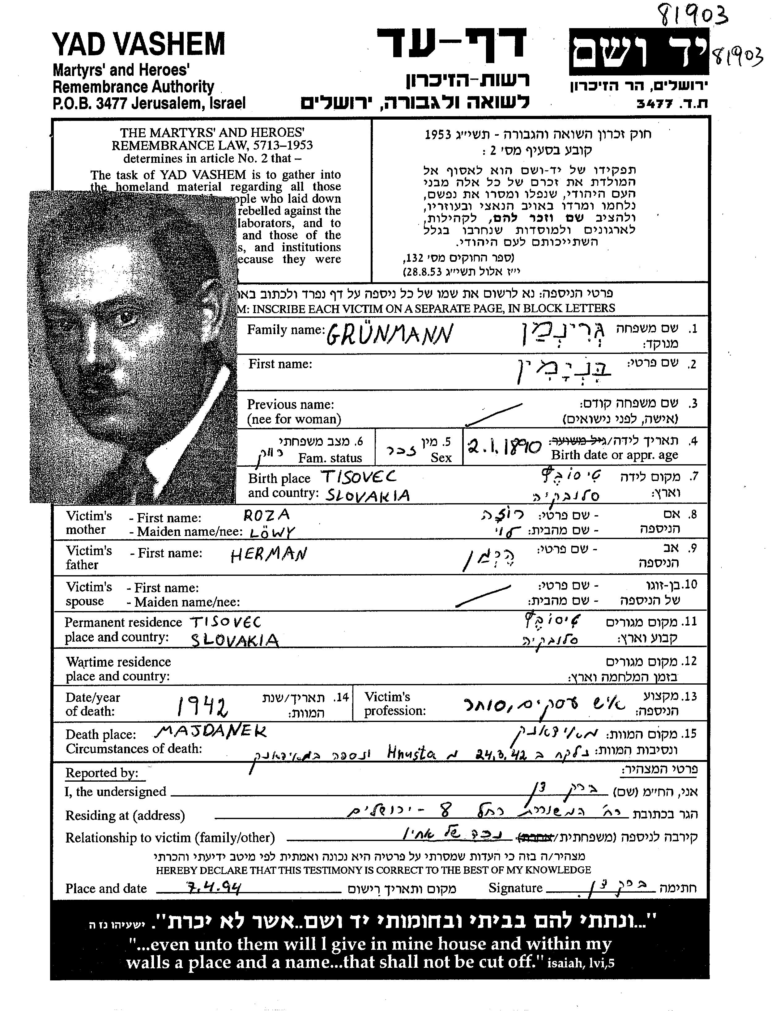 Grünmann | Benyamin | 1890 | Tisovec, Tschechoslowakei | Gedenkblatt |
