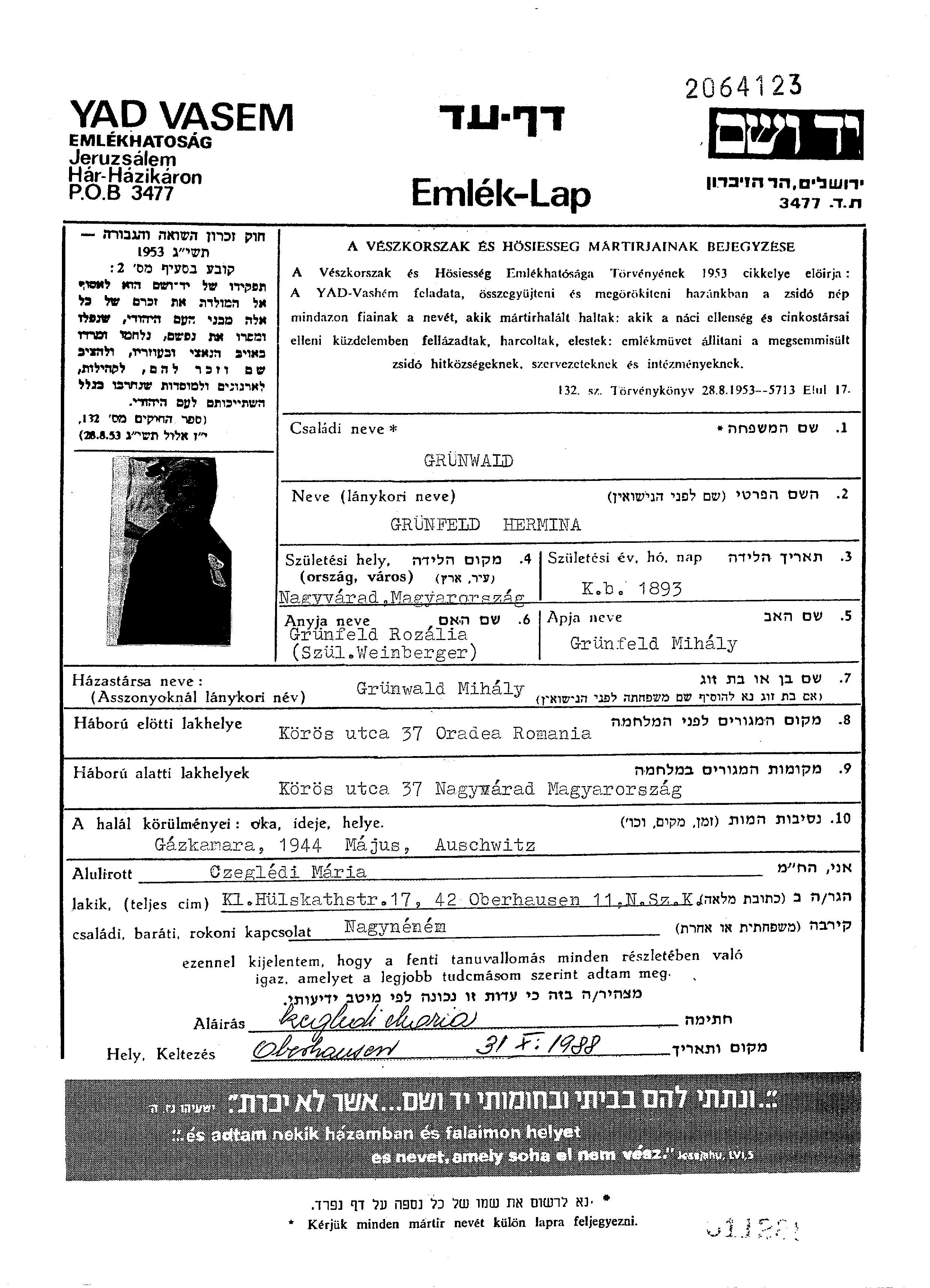 Grünwald Hermina 1893 Oradea, Rumänien Gedenkblatt