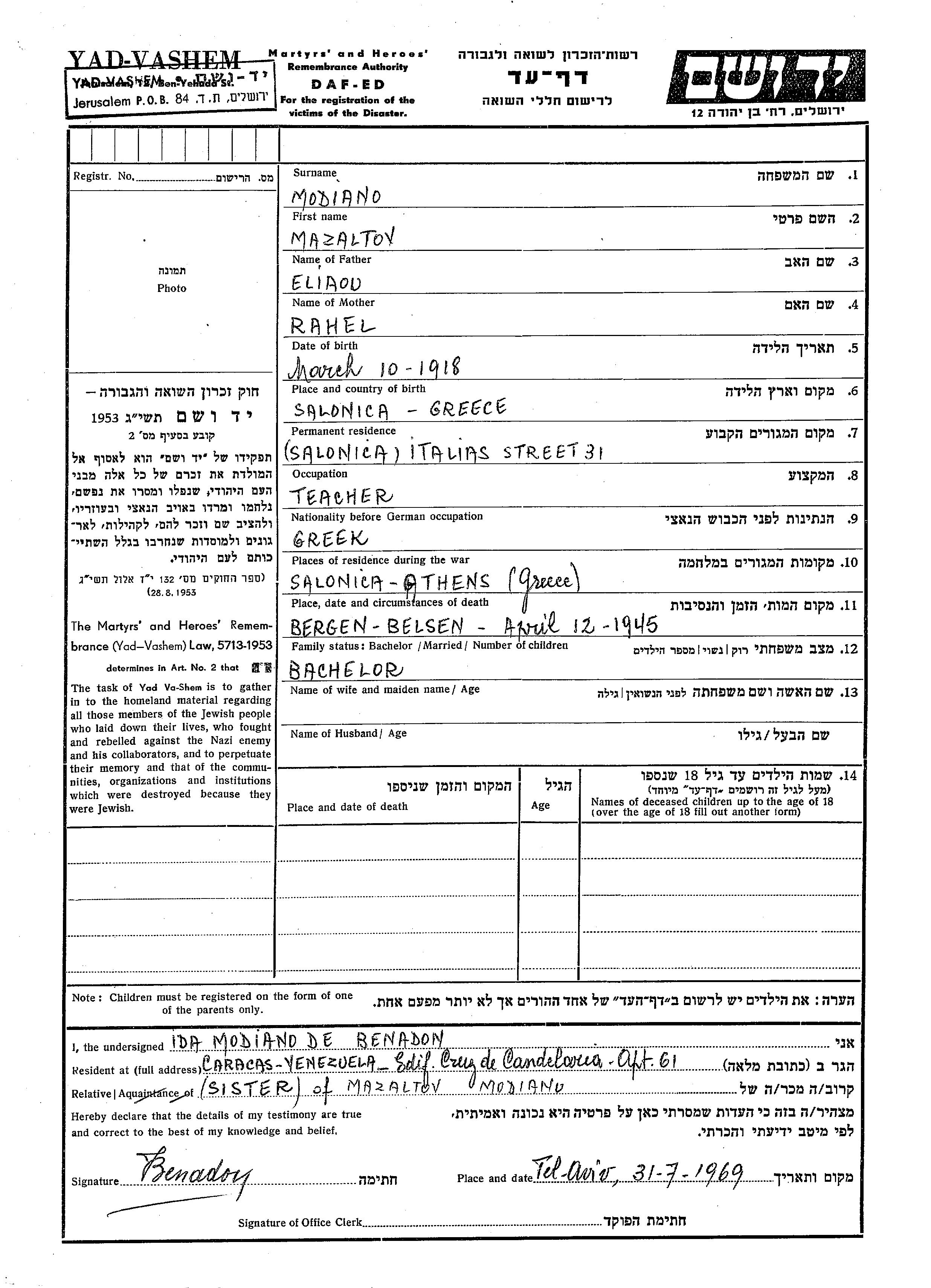 Mazaltov Modiano wurde im Jahr 1918 in Salonika, Griechenland geboren. Sie war Lehrer/in. Vor dem Zweiten Weltkrieg lebte sie in Thessaloniki, Griechenland.