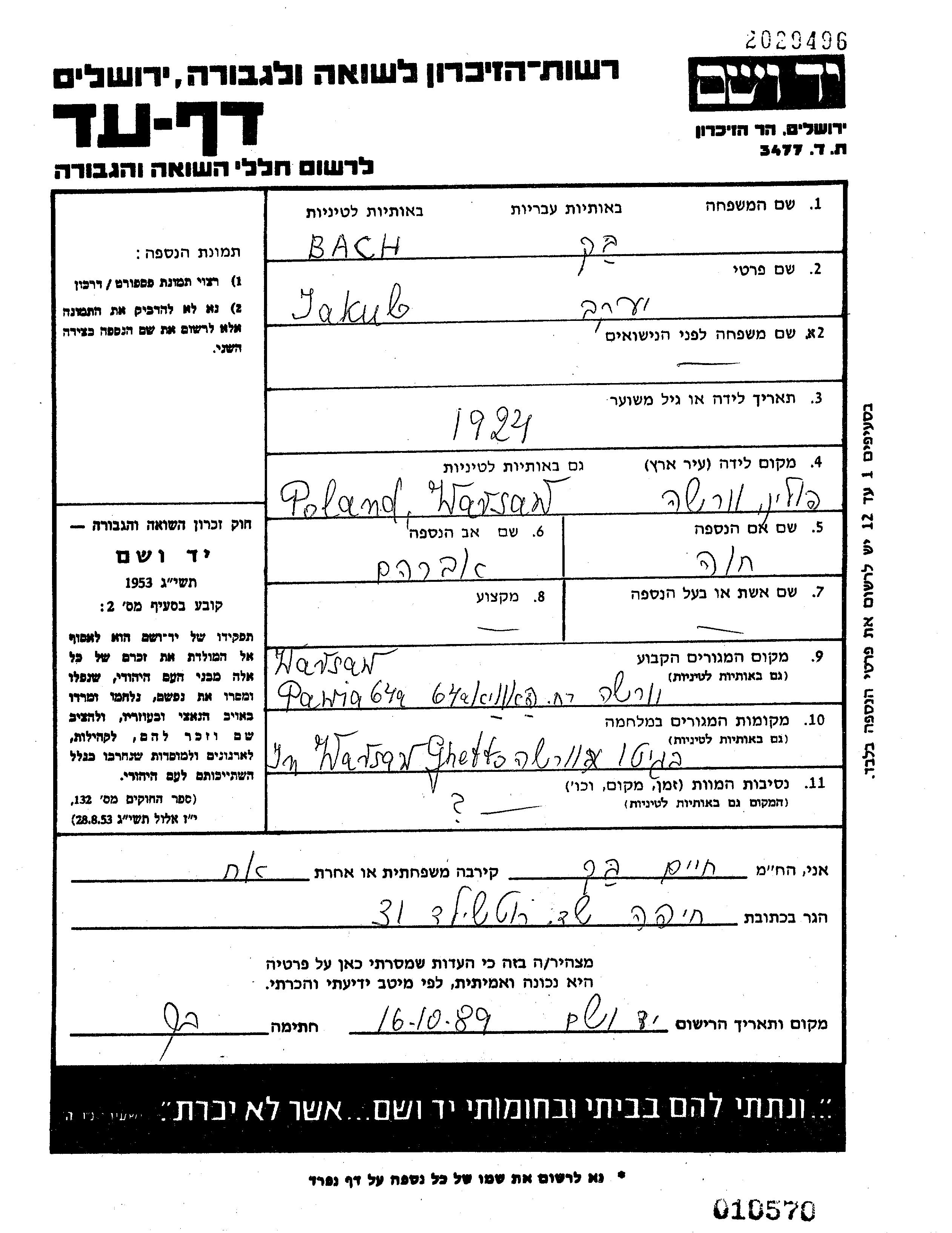 Yaakov Bach wurde im Jahr 1924 in Warszawa, Polen geboren. Vor dem Zweiten Weltkrieg lebte er in Warszawa, Polen.