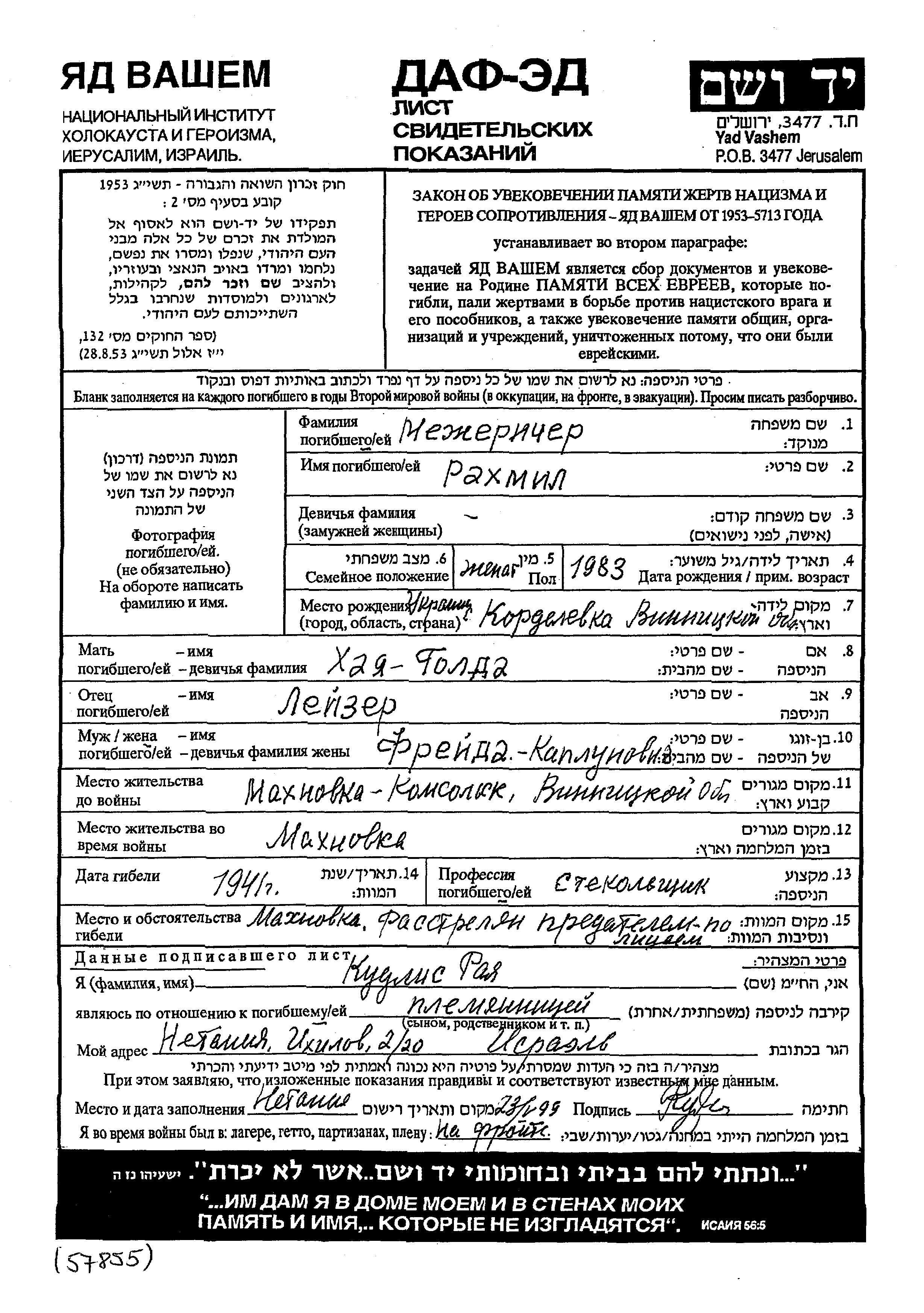 Rakhmil wurde in der Schoah ermordet. Todesort: Komsomolskoye, Ukraine (UdSSR) im Jahr 1941.