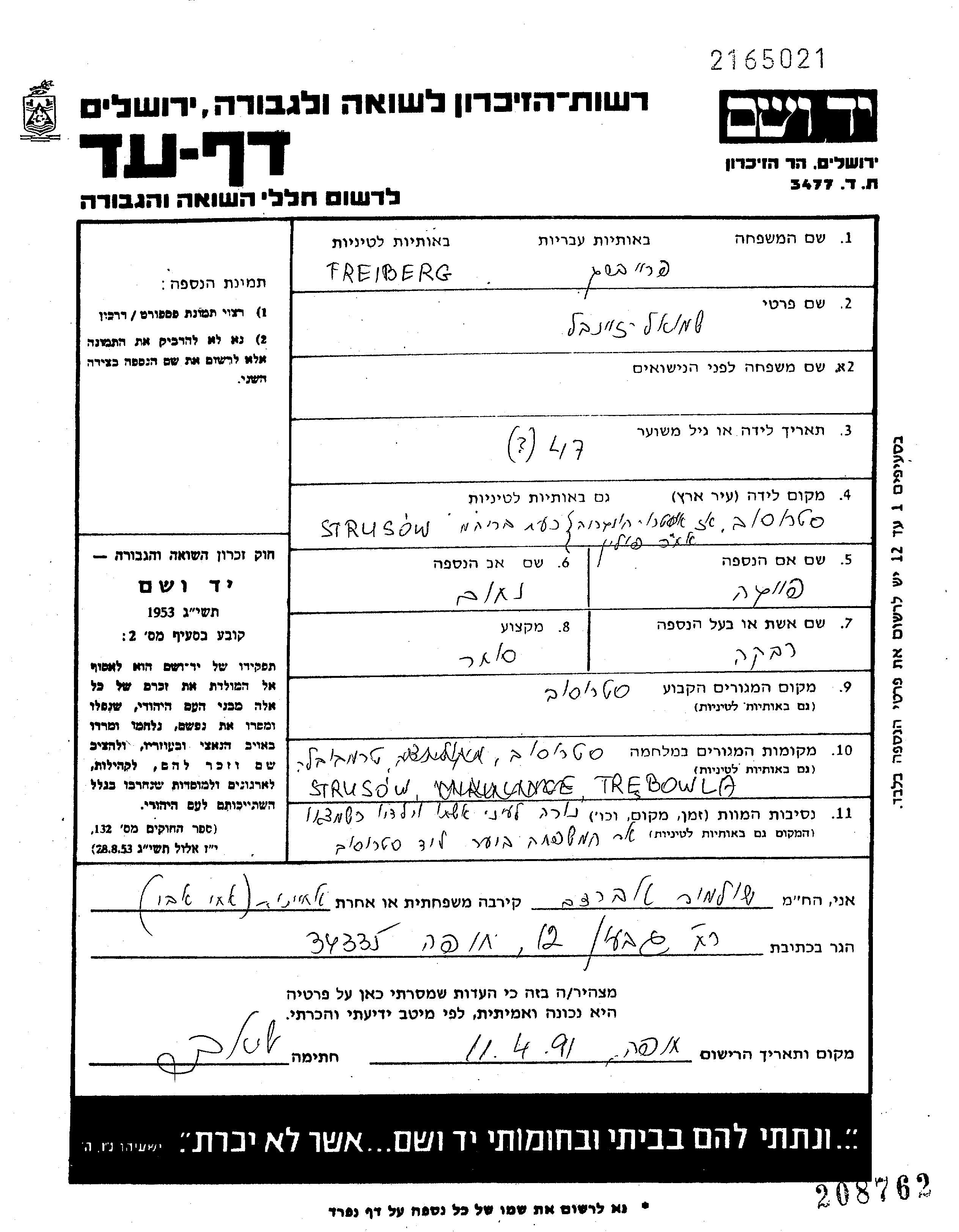 Shmuel Freiberg wurde im Jahr 1895 in Strusow, Polen geboren. Er war Kaufmann/-frau. Vor dem Zweiten Weltkrieg lebte er in Strusow, Polen.