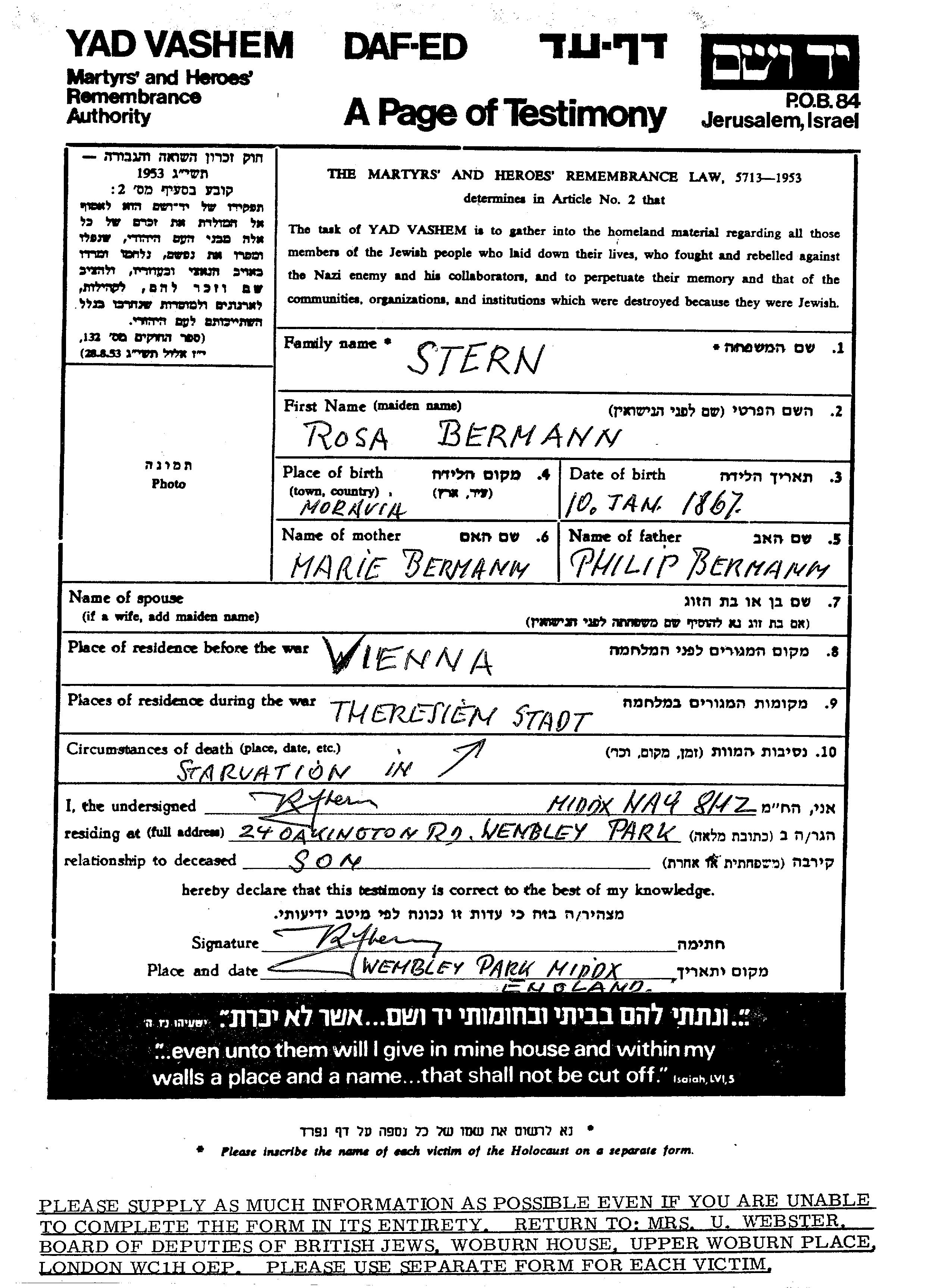 Rosa wurde in der Schoah ermordet. Todesort: Theresienstadt, Tschechoslowakei im Jahr 1942.