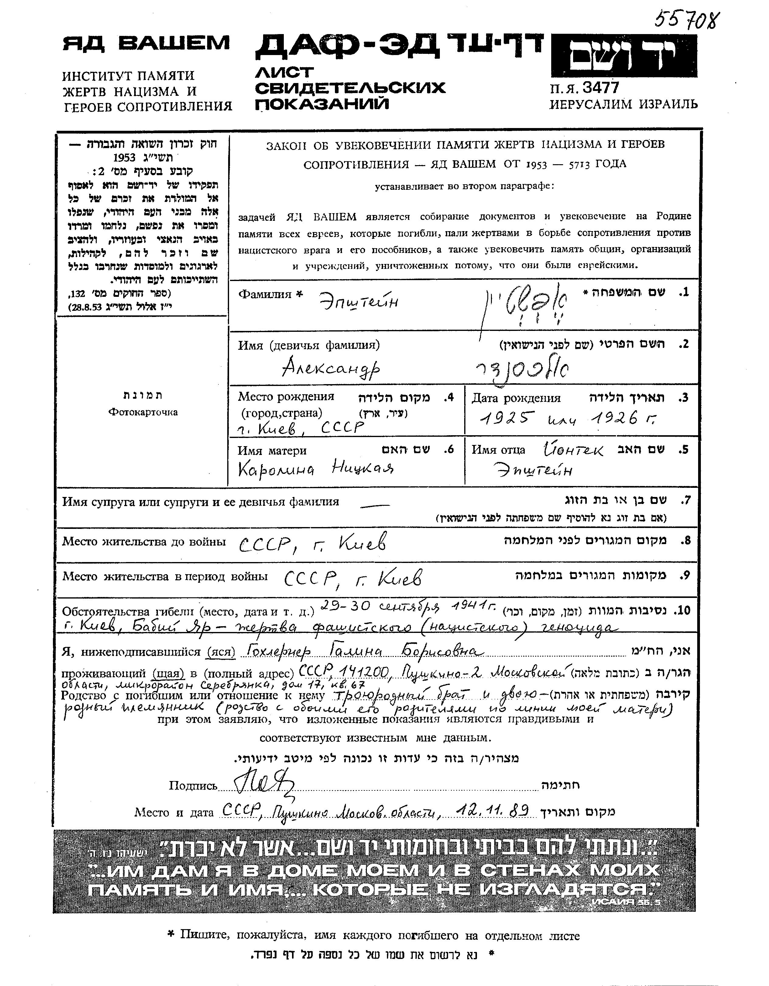 Aleksander wurde in der Schoah ermordet. Todesort: Babi Yar, Ukraine (UdSSR) im Jahr 29/09/1941.