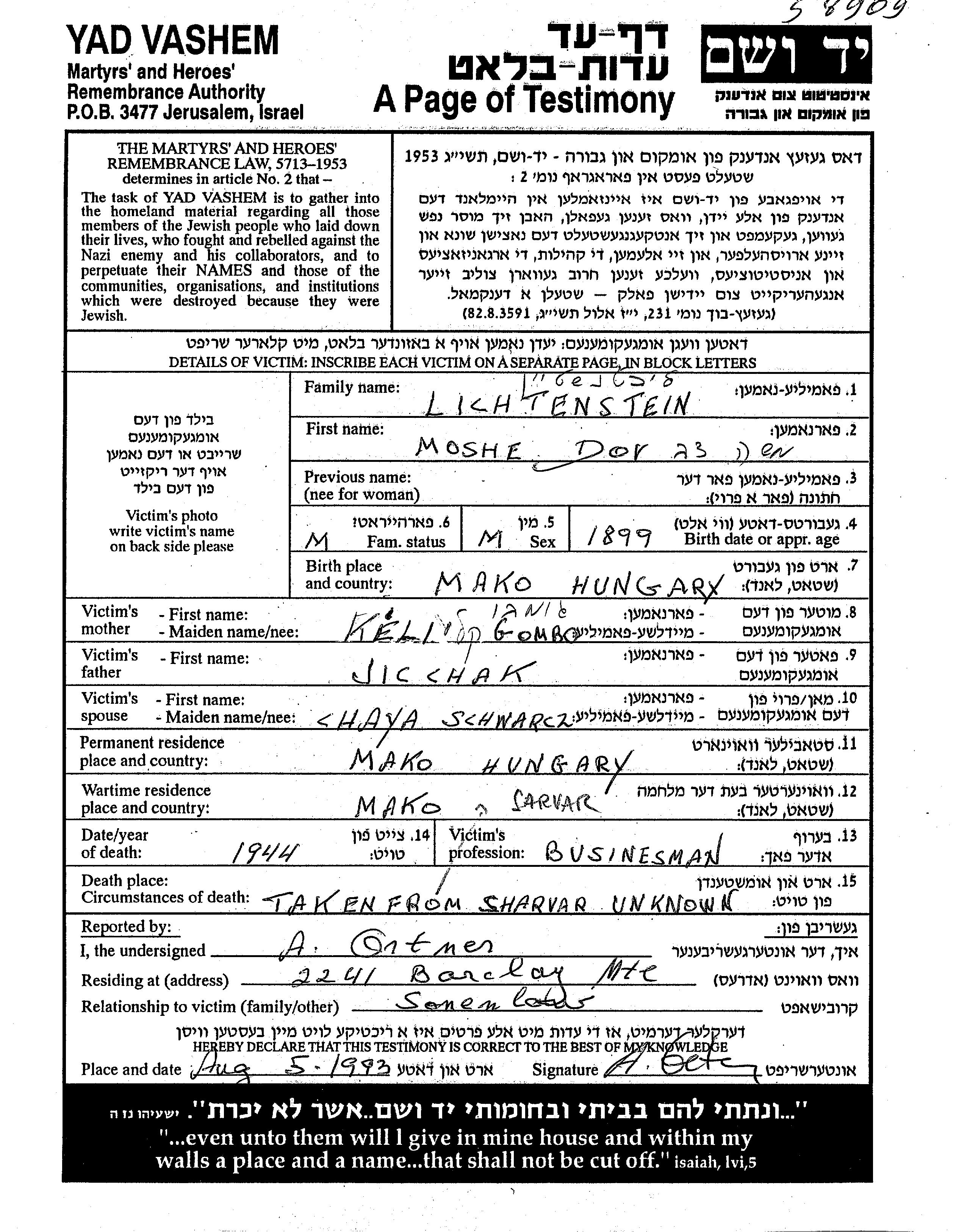 | Lichtenstein | Moshe Ber Dov | 1900 | Mako, Ungarn | Photos |