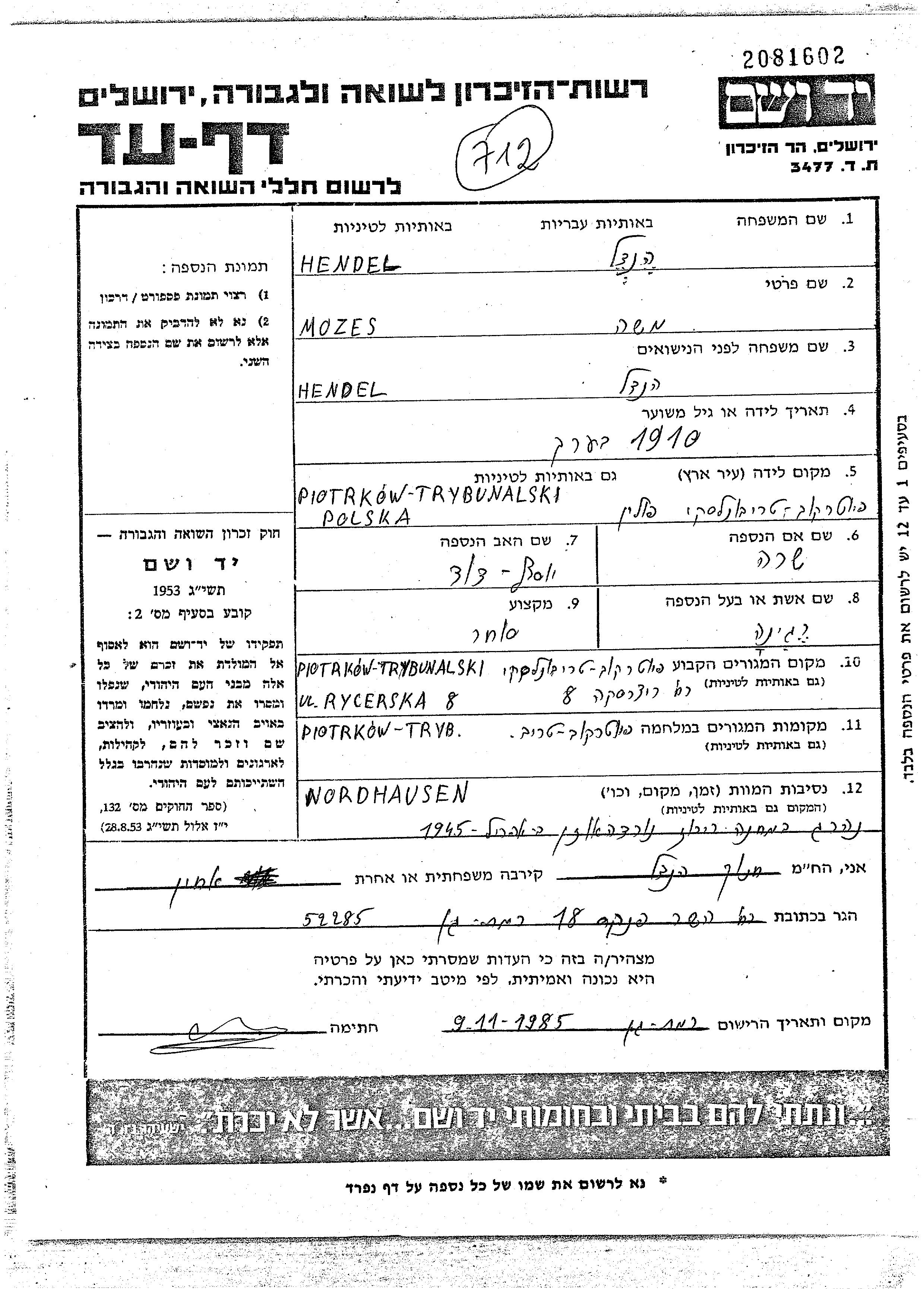 Hendel Moshe 1910 Piotrkow Trybunalski, Polen Gedenkblatt
