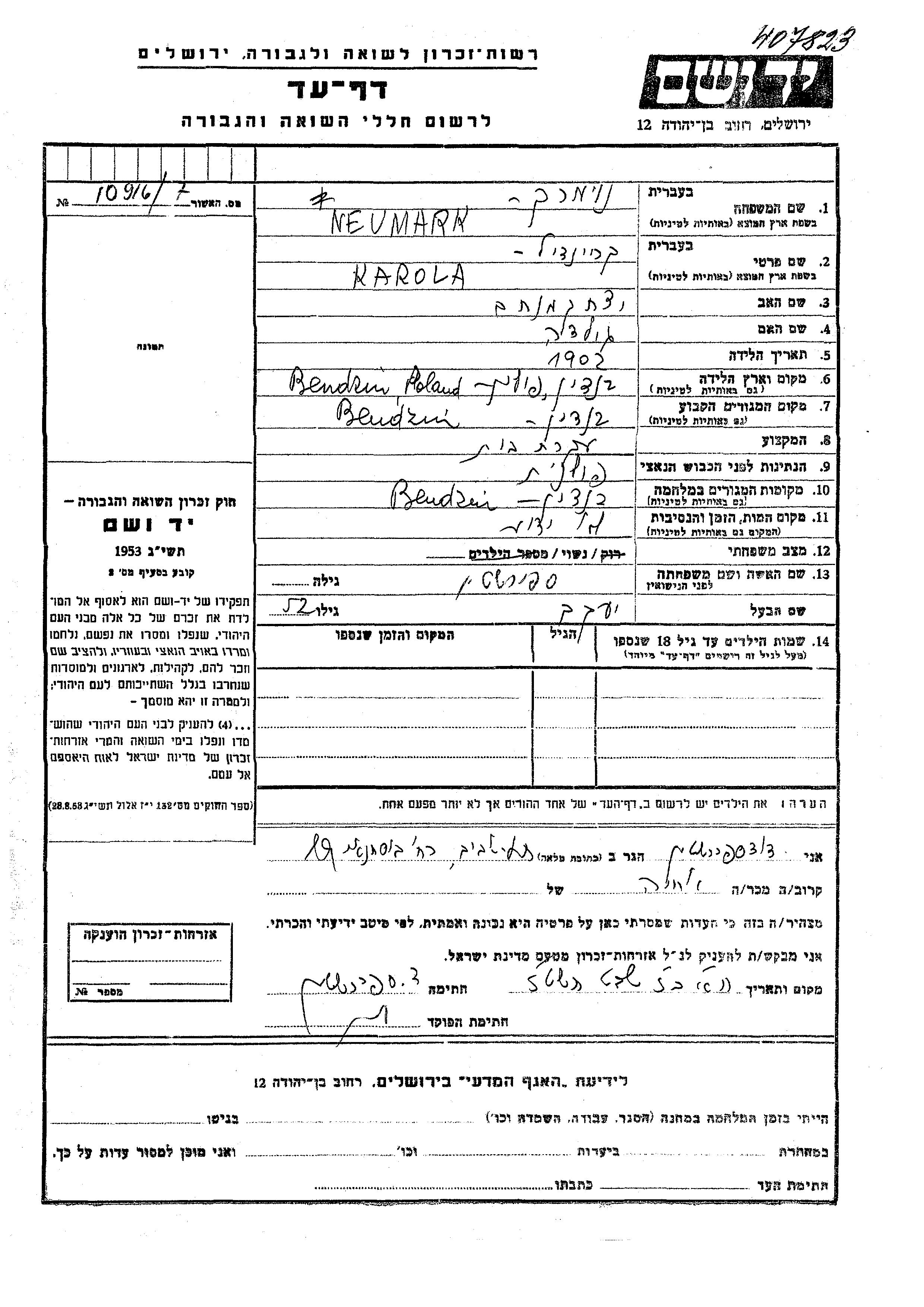Neumark Kreindil Karola 1902 Bendzin, Polen Gedenkblatt