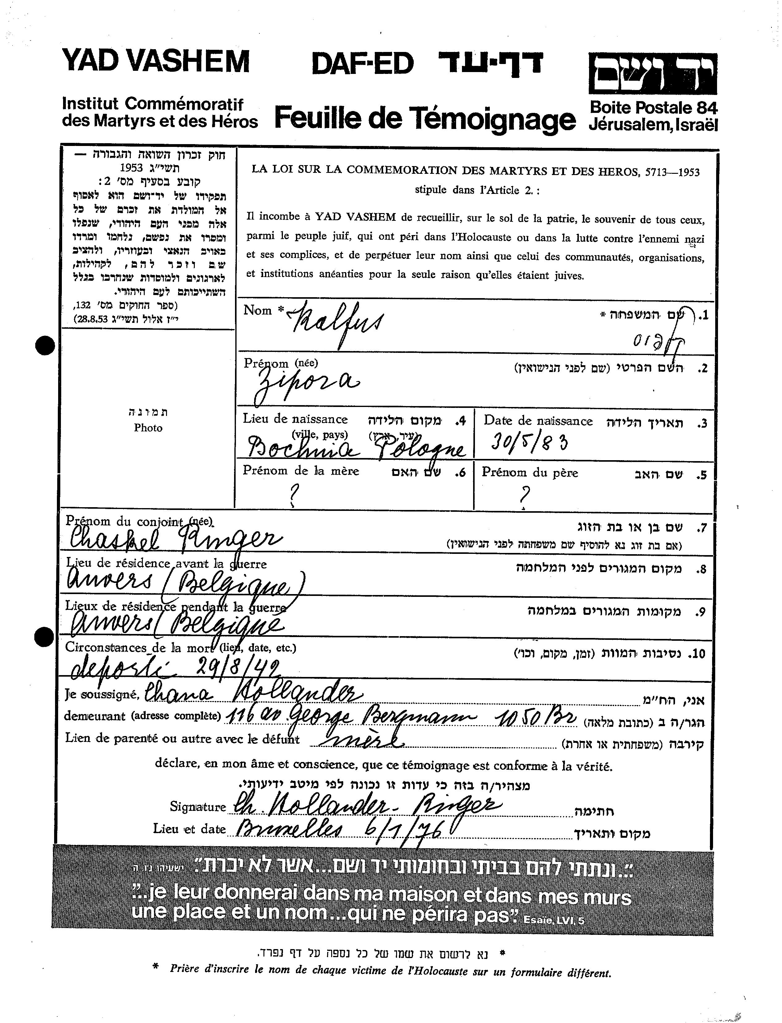 Zipora wurde in der Schoah ermordet. Todesort: unbekannter Ort im Jahr 29/08/1942.