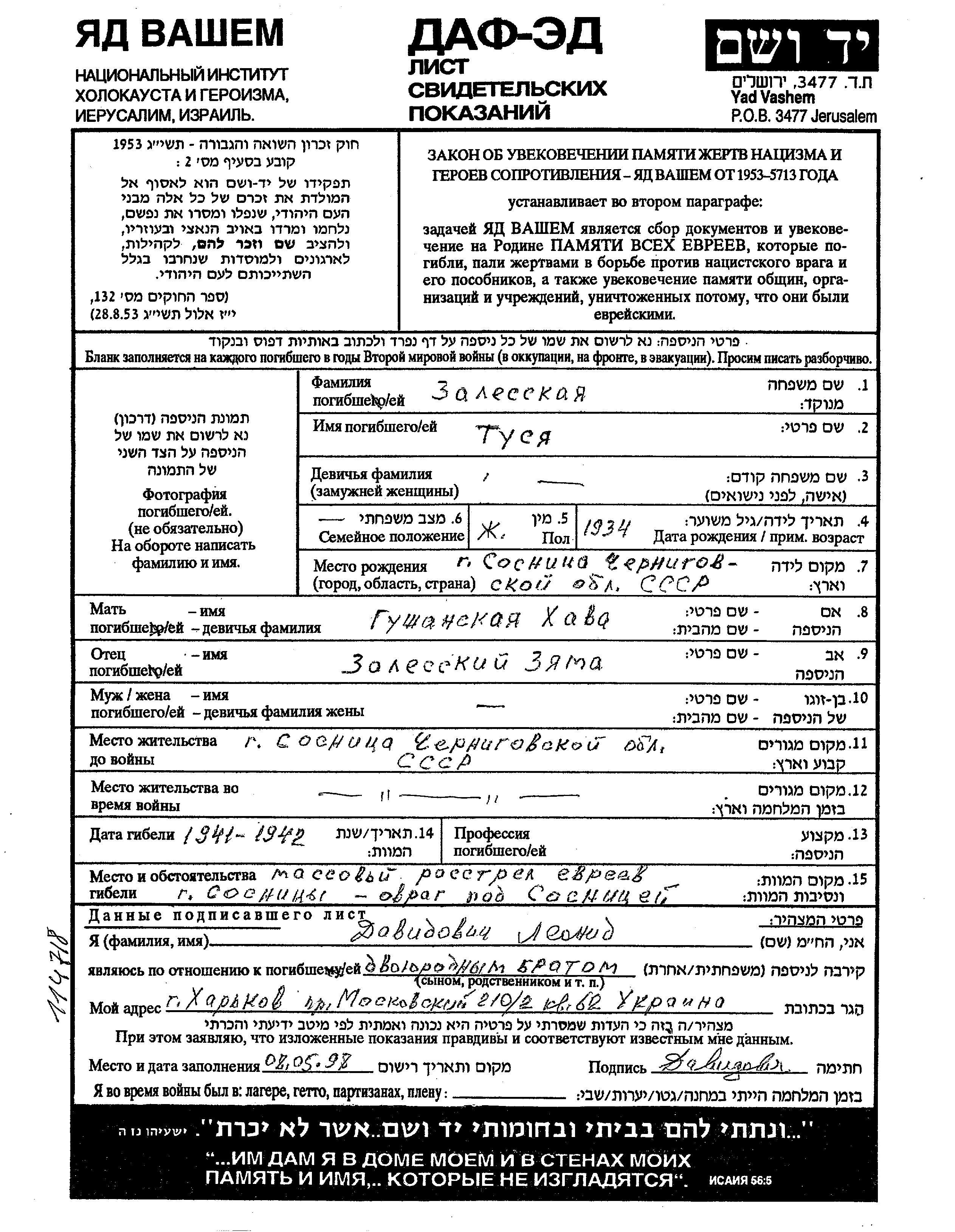 Tusya wurde in der Schoah ermordet. Todesort: Sosnitsa, Ukraine (UdSSR) im Jahr 1941.